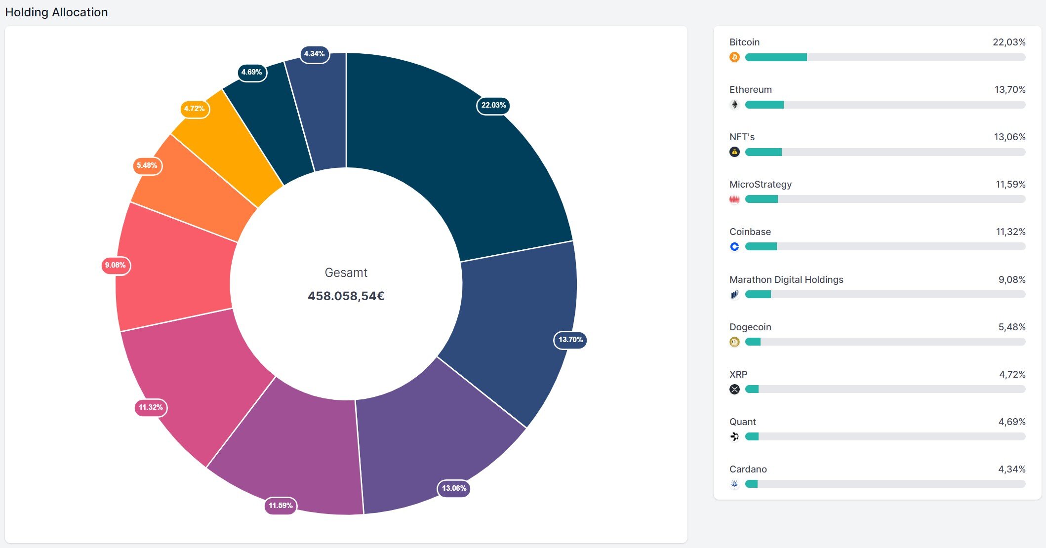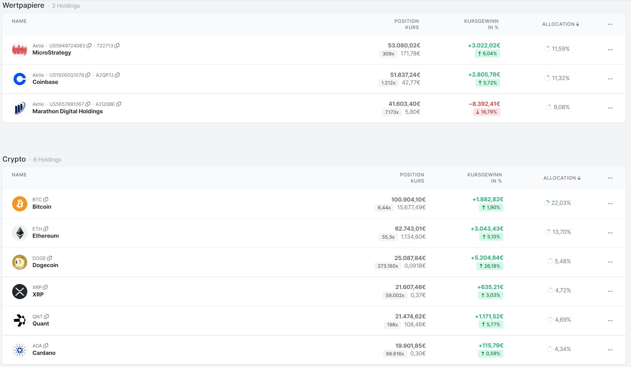 sicario86 November 28, 2022 Depotupdate: trotz katastrophalem Crypto-Winter hält sich mein Depot sehr gut (Diversifikation sei Dank) und ist weiter fest auf Kurs Richtung 7-stellig. Wütend bin ich zwar über die Verluste bei Marathon Digital, aber die Outperformance des Dogecoin macht das wieder wett Diesen Beitrag teilen Link zum Beitrag