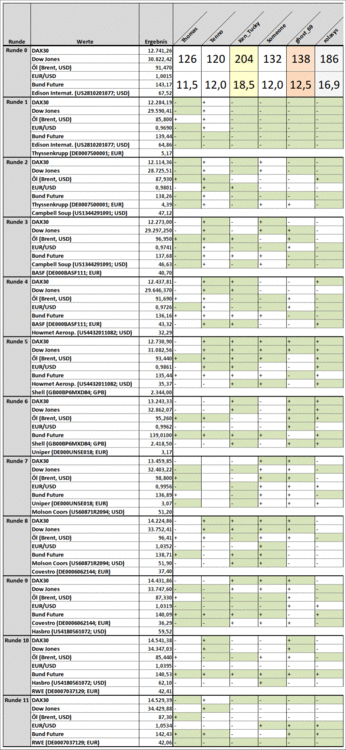Thomas November 26, 2022 Hallo zusammen, eine weitere Börsenwettrunde beginnt. Viel Spaß beim Wetten. Tippabgabe bis Montag 17:00 Uhr --> 11. Runde von 11 Runden. Neue Startwerte und Veränderung aus der letzten Runde: 1. DAX30: 14541,38 (+) 2. Dow Jones: 34347,03 (+) 3. Öl (Brent, USD): 85,44 (-) 4. EUR/USD: 1,0395 (+) 5. Bund Future: 140,53 (+) 6. Hasbro (US4180561072; USD) : 62,1 (+) 6. (Neu) RWE (DE0007037129; EUR): 42,41 Informationen: Erst Tippabgabe! Danach können weitere Beiträge verfasst werden. Anders herum wird disqualifiziert! Die ersten 5 Werte stehen während der ganzen Tippsaison fest. Der 6. Wert wechselt von Runde zu Runde. Vorschläge für einen 6. Wert werden jederzeit entgegengenommen. Es dürfen jederzeit auch neue Spieler einsteigen und sich am laufenden Spiel beteiligen. Regeln: https://www.wertpapier-forum.de/topic/368-regeln-und-informationen-für-die-börsenwette/ Fragen: https://www.wertpapier-forum.de/topic/1420-fragen-zur-börsenwette-hier-rein/ Bitte die Tipps im vorgegebenen Format abgeben! So sieht der richtige Code als Beispiel aus: [hide ] (hier das Leerzeichen noch entfernen vor "]") 1. + 2. - 3. - 4. + 5. + 6. - [/hide] Mein Tipp: Läuft doch. Wie Putler ... alles nach Plan liebe Genossen. Nach der Gesamtrunde würde ich erstmal eine Weihnachtspause einlegen und der nächste Start wäre dann am 6. Januar 2023, wenn es für Euch okay ist. Versteckter Inhalt Du kannst den versteckten Inhalt sehen, sobald du auf dieses Thema antwortest. Diesen Beitrag teilen Link zum Beitrag
