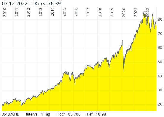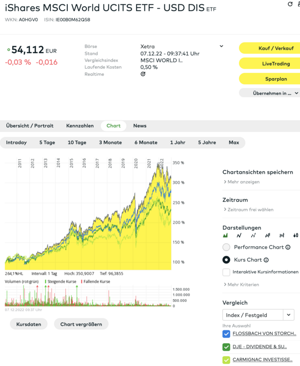 Siehst Du? Von Anfang 2010 bis Anfang 2022 sieht man mehr als eine Vervierfachung. In Deinem Diagramm sieht man aber nur einen Faktor 3,5. In Deinem Diagramm werden die Ausschüttungen beim MSCI World nicht angezeigt.