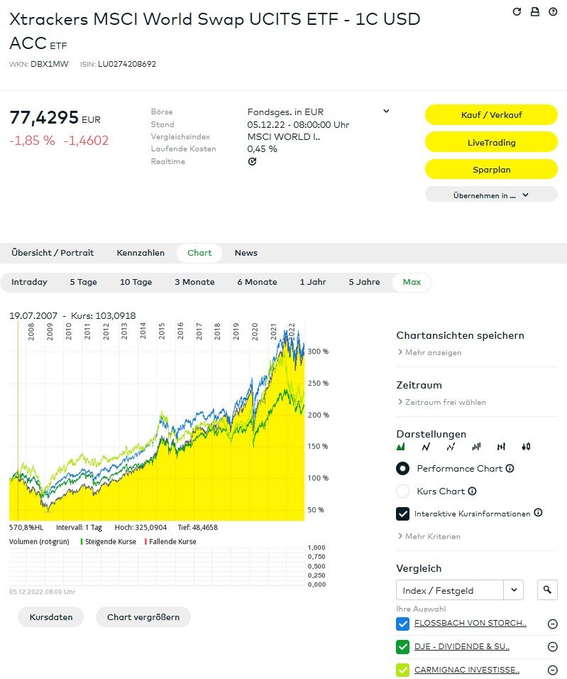 Um solche Charts zu überprüfen, nehme ich einen thesaurierenden MSCI World ETF hinzu. Hilfreich ist der Xtrackers MSCI World Swap UCITS ETF - 1C USD ACC , WKN: DBX1MW ISIN: LU0274208692. Den gibt es schon recht lange.