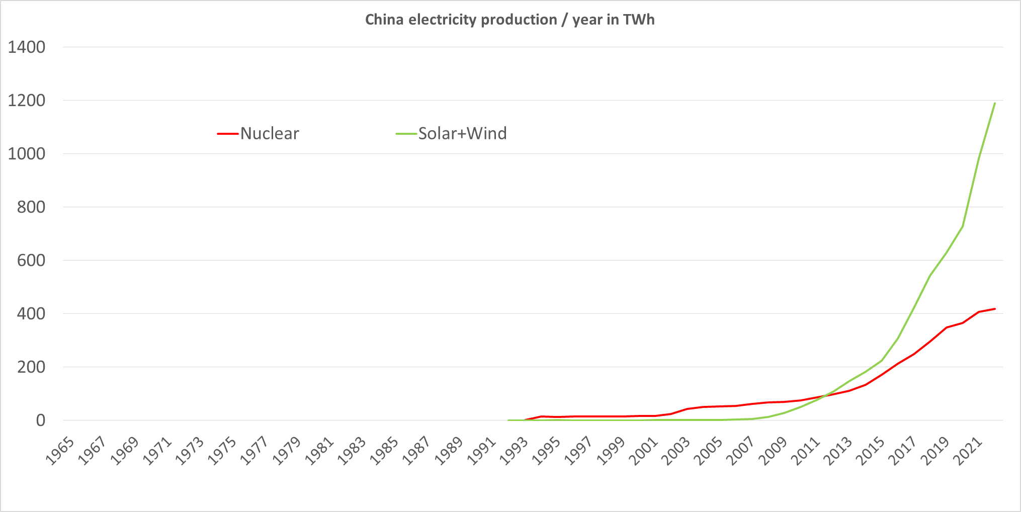 Tatsächlich lautet aber die aktuelle Zubauprognose für neue PV Leistung in China für das Jahr 2023 ca. 150 Gigawatt. Von Januar bis April waren es 48GW. Nur die neuen PV und Windkraftwreke, die China im Jahr 2023 installieren wird werden schon soviel Strom pro Jahr produzieren, wie alle in den letzten 30 Jahren in China gebauten Kernreaktoren zusammen.