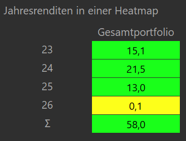 Jennerwein 4. Januar · bearbeitet 8. Januar von Jennerwein Das erfolgreiche Börsenjahr 2025 ist vorbei. Mit der Jahresrendite von 13% bin ich sehr zufrieden. Die Trump-Tax-Krise konnte zur Depotkonsolidierung und zum Nachkauf genutzt werden. Zielrichtung KISS. Neuinvestitionen und Reinvestitionen der Ausschüttungen gehen derzeit in den ausschüttenden Vanguard All World. 2026 werden die Neuinvestitionen weiter zurück gefahren. Das Arbeitseinkommen wird 2026 voraussichtlich weiter sinken, da ich meinen Arbeitseinsatz weiter reduzieren will. Diesen Beitrag teilen Link zum Beitrag