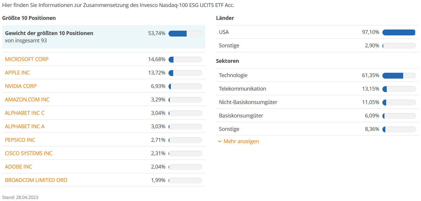Glory_Days Juni 18, 2023 · bearbeitet Juni 18, 2023 von Glory_Days Wie ist eure Meinung zu Nasdaq-100 ESG Produkten? Zitat The Nasdaq-100 ESG Index is designed to measure the performance of the companies in the Nasdaq-100 Index that meet specific ESG criteria. Companies are evaluated and weighted on the basis of their business activities, controversies and ESG Risk Ratings. The Index began on June 21, 2021 at a base value of 1000.00. https://indexes.nasdaqomx.com/index/overview/ndxesg XNDX: NASDAQ-100 Total Return NDXESGT: Nasdaq-100 ESG Total Return Index Bisher scheint nur Invesco einen Nasdaq-100 ESG ETF aufgelegt zu haben (ISIN: IE000COQKPO9, TER: 0,25% p.a.). Diesen Beitrag teilen Link zum Beitrag