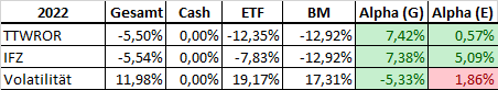 DST Januar 11, 2023 · bearbeitet Januar 11, 2023 von DST Meine Performance: Gesamt = Gesamtes Portfolio = Cash + ETF-Portfolio (nach Steuern) Cash = Risikoarme Anlagen wie Tagesgeld (vor Steuern) ETF = ETF-Portoflio (vor Steuern) BM = Benchmark = SPDR MSCI ACWI IMI (vor Steuern) Alpha (G) = Differenz zum BM (Gesamt) Alpha (E) = Differenz zum BM (ETF) Mit meiner ETF-Strategie habe ich meinen BM um 0,57% (TTWROR) bzw. 5,09% (IFZ) geschlagen und mit meinem Gesamten Portfolio um 7,42% (TTWROR) bzw. 7,38% (IZF). Der IZF meiner ETF-Strategie ist u. a. aufgrund von Market-Timing höher als die TTWROR. Ich investiere aktiv in mehr als 10 ETFs, wovon ich einen am Jahresende verkauft habe (Bund-Future-Short-ETF). Meine Quote an riskanten Anlagen (Aktien + Anleihen-Short) schwankte zwischen 50 und 100 Prozent. Aktuell bin ich zu mehr als 80% in Aktien investiert. Diesen Beitrag teilen Link zum Beitrag