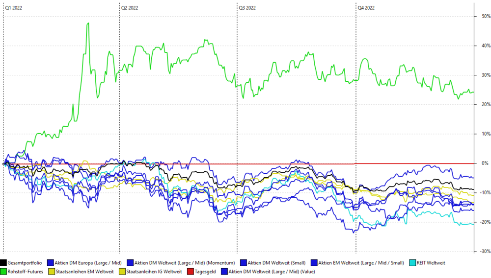 C-Dog Januar 6, 2023 Bei mir sind es -8,8% insgesamt: Aufteilung wie gehabt mit 10 Positionen à jeweils 10%: (DM = Developed Markets, EM = Emerging Markets, IG = Investment Grade) Also in Summe: 50% Aktien 20% Anleihen 10% REITs 10% Rohstoffe 10% TG Im Jahresverlauf fallen vor allem die Rohstoffe auf, die natürlich mit 10% Anteil nicht viel, aber doch etwas die Verluste reduzieren konnten: Denke, mit nur 10% RK 1 kann ich beim allgemeinen Marktverlauf mit dem Ergebnis trotz des Negativvorzeichens noch zufrieden sein. Diesen Beitrag teilen Link zum Beitrag