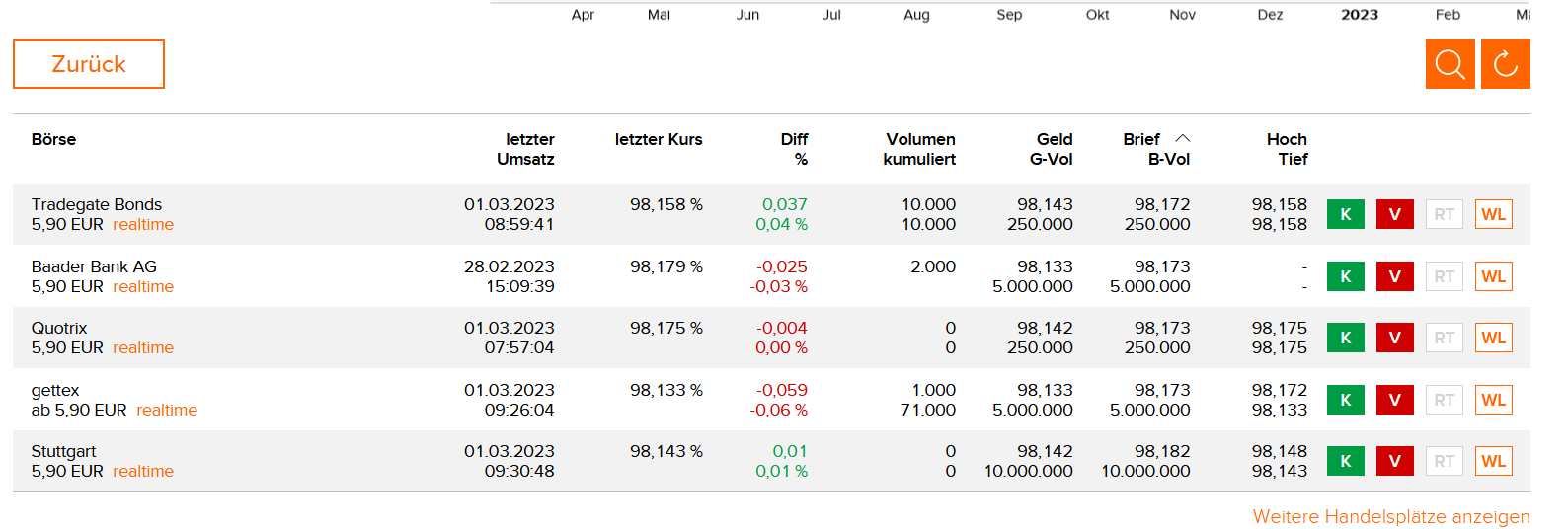 Beim Kauf der Staatsanleihe mit der ISIN DE0001141786 über Gettex habe ich den Eindruck, dass ich mit 98,171 % keinen wirklich guten Kurs erhalten habe, sodass ich das Limit wohl hätte tiefer ansetzen sollen.
