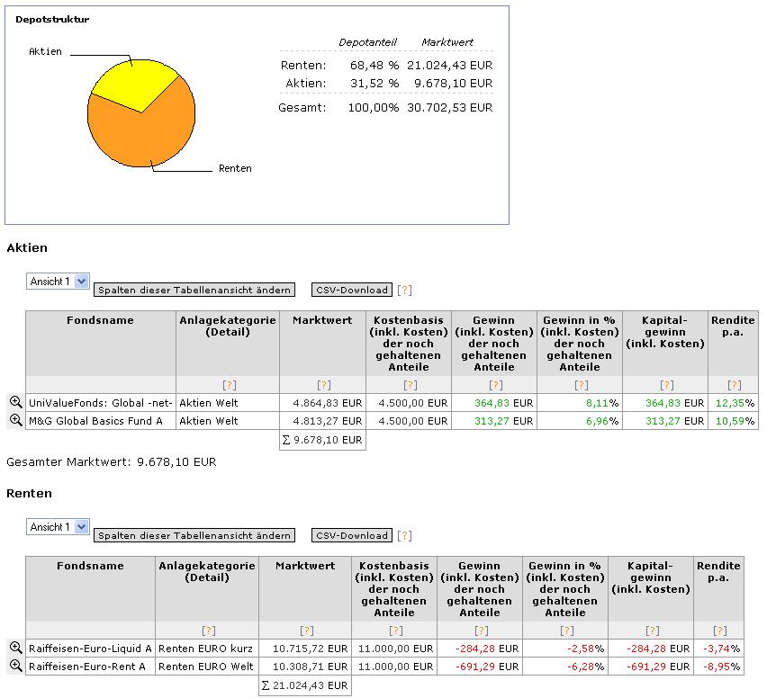 DrFaustus September 4, 2006 · bearbeitet September 4, 2006 von DrFaustus Moin, es geht hier um die Vermögensanlage für eine 50-jährige Beamtin. Zur freien Verfügung stehen aufgrund einer Scheidung nur noch ca. 30.000 , die momentan noch auf einem Tagesgeldkonto liegen. Sicherheitsreserven sind zusätzlich vorhanden, also der o. g. Betrag wird in den nächsten Jahren voraussichtlich nicht benötigt. Ebenso hat sie bereits eine (kleine) private Rentenversicherung abgeschlossen. Von der Hausbank wurde nun Festzinsanlagen empfohlen (Zinssatz um die 4-5 %). Das Ganze soll in erster Linie als Altersvorsorge dienen. Nun soll die von der Bank empfohlene Anlageform durch Fonds geschlagen werden. Ich habe mir dazu Folgendes überlegt: M&G GLOBAL BASICS GB0030932676 4500 RAIFFEISEN-EURO-LIQU AT0000859541 11.000 RAIFFEISEN-EURO-RENT AT0000996681 11.000 UNIVALUE GLOBAL NET LU0126316180 4.500 Was haltet ihr von dem Depot und von der Aufteilung? Sollten noch weitere Fonds hinzugezogen werden? Ist der 30%-ige Anteil der spekulativen Fonds zu hoch? Vielen Dank für eure Meinungen... Grüße Ich entnehme deinem Text, dass die Planung nicht für Dich ist. Von daher ist es völlig egal, ob wir oder du den spekulativen Anteil zu hoch finden. Entscheidend ist die Risikoneigung der Beamtin (Kundin) wollte ich schon fast schreiben. Das gilt es als erstes abzuklären! Wenn Sie sagt sie will 0% spekulativ anlegen, dann ist das so und dann kannst du ihr auch nicht mit dem M&G GLOBAL BASICS und auch nicht mit einem noch so guten Aktienfonds kommen. Diesen Beitrag teilen Link zum Beitrag
