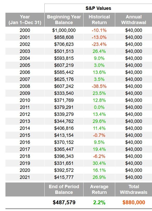 Nachfolgende 4% Entnahme wie von dir Vorgeschlagen beim S&P500 -> 400k am Ende übrig.