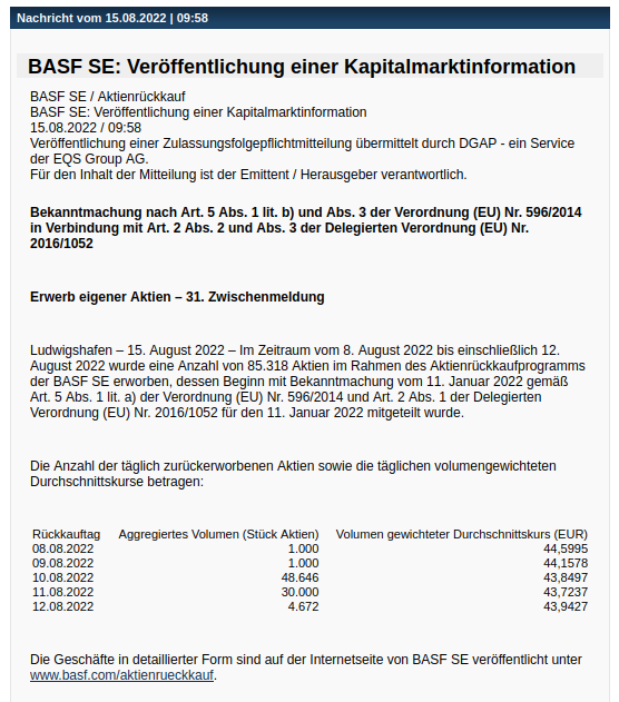 boersenschwein Juli 25, 2022 Hier wird schon etwas eingehender umschrieben. https://www.bafin.de/DE/Aufsicht/BoersenMaerkte/Emittentenleitfaden/Modul3/Kapitel4/Kapitel4_1/kapitel4_1_node.html Man muss bedenken, dass beim Rückkauf einer gigantischen Einzelmenge es zu einer Marktbeeinflussung kommt, was nach entsprechenden Richtlinien verboten ist. Diesen Beitrag teilen Link zum Beitrag