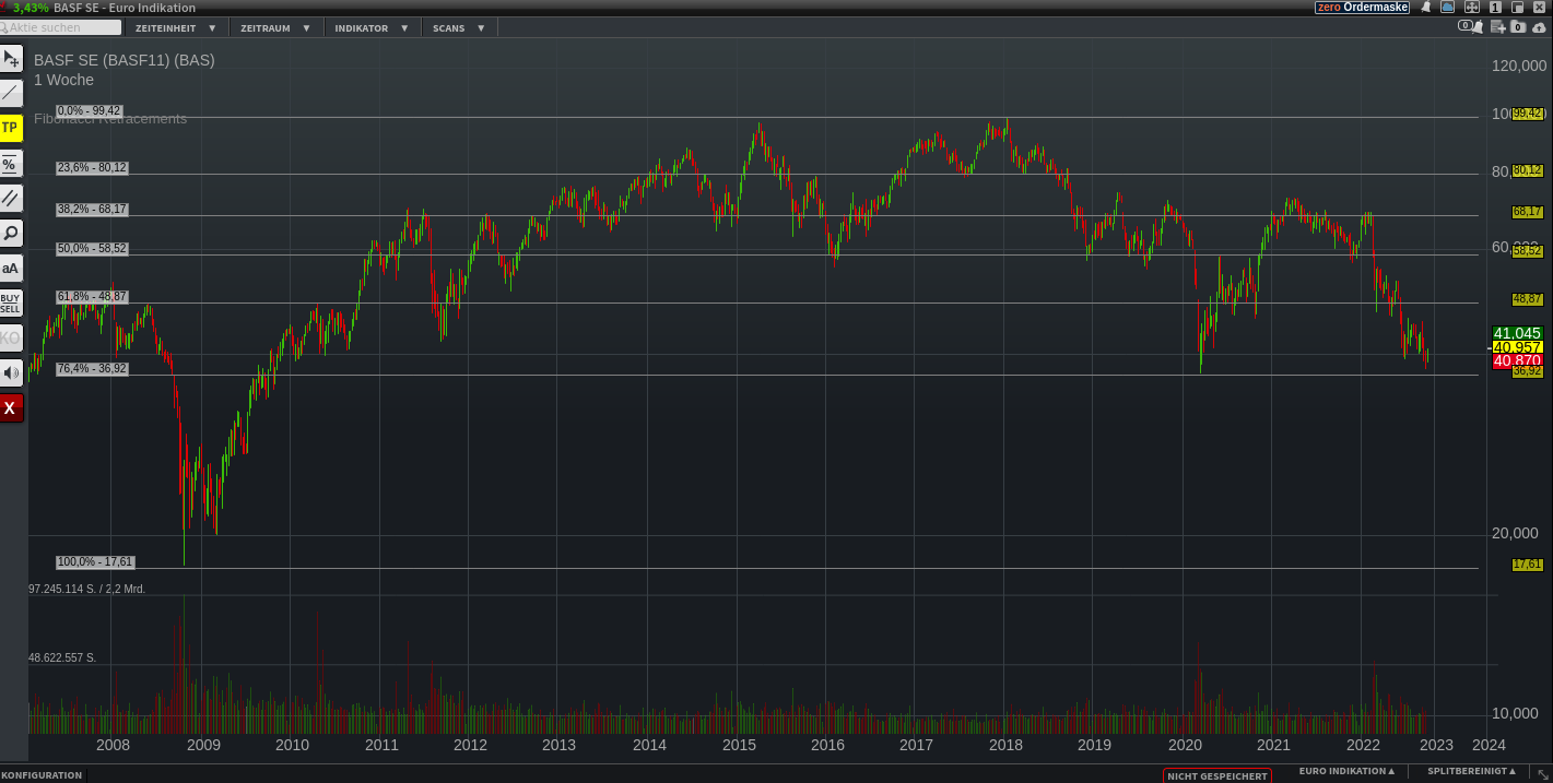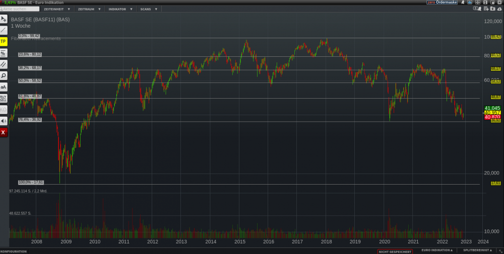 boersenschwein Oktober 3, 2022 vor 7 Stunden von uth_broker: Der Abwärtskanal bei BASF ist leider sehr stabil und eindeutig: Andrerseits ist das KGV inzwischen sehr niedrig und auch die Dividendennrendite attraktiv. Ob da wohl tatsächlich wieder 3,40 € pro Aktie ausgeschüttet werden? Ich behalte den Zykliker BASF auf dem Schirm und hoffe, vielleicht zu einem günstigen Zeitpunkt einsteigen zu können. NOCH halte ich es für deutlich zu früh. ist immer eine Betrachtungsweise. Ich sehe da keinen Abwärtstrend mehr, eher ein breiter Seitwärtslauf. Selbst auf Wochenbasis wird nunmehr nochmal die Fibo 76,4% Unterstützung getestet. Diesen Beitrag teilen Link zum Beitrag