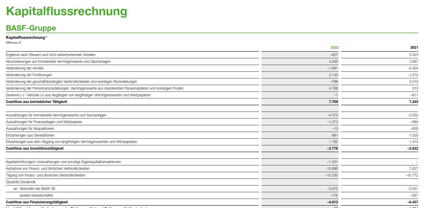 boersenschwein Februar 24, 2023 · bearbeitet Februar 24, 2023 von boersenschwein geht auch auf deutsch Zitat BASF zeigt Widerstandskraft in einem schwierigen Marktumfeld und setzt Maßnahmen zur Stärkung der Wettbewerbsfähigkeit um Umsatz: 87,3 Milliarden Euro (plus 11,1 Prozent) EBIT vor Sondereinflüssen: 6,9 Milliarden Euro (minus 11,5 Prozent) Cashflow aus betrieblicher Tätigkeit: 7,7 Milliarden Euro (plus 6,4 Prozent); Free Cashflow: 3,3 Milliarden Euro (minus 10,2 Prozent) Dividendenvorschlag von 3,40 Euro je Aktie für das Geschäftsjahr 2022 (2021: 3,40 Euro je Aktie) Konkrete Maßnahmen zu Kosteneinsparungen in Europa und zur Anpassung der Verbundstrukturen in Ludwigshafen vorgestellt Ausblick 2023: Umsatz zwischen 84 Milliarden Euro und 87 Milliarden Euro prognostiziert EBIT vor Sondereinflüssen zwischen 4,8 Milliarden Euro und 5,4 Milliarden Euro erwartet https://www.basf.com/global/de/media/news-releases/2023/02/p-23-131.html CF war doch recht gut Diesen Beitrag teilen Link zum Beitrag