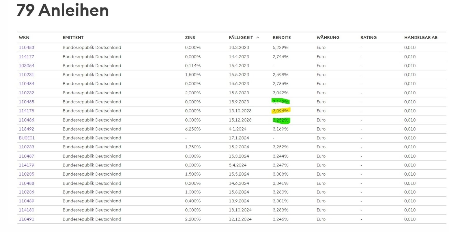 Newbi März 6, 2023 Hi zusammen, aktuell habe ich von meinem gesamten Portfolio 70% in Aktien und 30% im Sicherheitsbereich (Hälfte Tagesgeld, Hälfte Anleihen ETF). Ich überlege ggf. in den nächsten 1-3 Jahren ein Haus zu kaufen, ist aber kein Muss, und nur wenn der Markt sich gut entwickelt. Aktuell deckt mein Portfolio aktuell 50% dees Hauspreises und jedes Jahr kommen 10% durch Sparen hinzu. Jetzt sind die 1-2% Tagesgeldzinsen nicht so der Kracher, in Festgeld wollte ich aber auch nicht anlegen, falls sich der Markt doch noch dreht und das ein oder andere Hausschnäppchen auf mich wartet. Daher die Idee in AAA Staatsanleihen zu gehen mit Fälligkeit in den nächsten 1-2 Jahren. Den Vorteil den ich hier sehe: a) Leicht höherer Zins (lukrativ im Vergleich zum geringen zusätzlichen Ausfallrisiko) b) Mehr Flexibilität: Wenn ich die Anleihe bis zum Ende halte ist es genauso wie Festgeld, zwischendruch verkaufen würde ich nur für den Hauskauf und der wird nur lukrativ wenn die Zinsen etwas sinken -> dann würde die Anleihe wieder steigen und ein Verkauf ist umso besser Hierzu 2 Fragen: a) Habe ich irgendeinen Denkfehler? b) Bzgl. der Auswahl der richtigen Anleihe: Habe ich es richtig verstanden dass ich wenn ich bei Börse Stutgart im Anleihenfinder Deutschland Auswähle eig. nur mir die Laufzeit raussuchen muss und dann die Anleihe mit der höchsten Rendite? Oder gibt es noch andere Sachen zu beachten? Sind diese bereits ab 10.000€ handelbar bei Onvista? Insbesondere manche Schwankungen in den Renditen verstehe ich nicht, z.B. das Absinken der gelbmarkierten Rendite hier: VG Diesen Beitrag teilen Link zum Beitrag