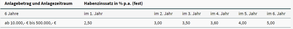 gravity September 9, 2023 Am 3.8.2023 um 21:45 von amybell: Die Zinsen für die 3-jährige Variante sind nochmals ein klein wenig nach oben korrigiert worden. Bei der 6-jährigen Variante gibt es leider wieder keine Anpassungen Zinserhöhung beim Anlagezeitraum 3 Jahre: im 1. Jahr 3,3% | im 2. Jahr 3,6% | im 3. Jahr 3,9% (Durchschnittlicher jährlicher Zinssatz: 3,6%) Diesen Beitrag teilen Link zum Beitrag