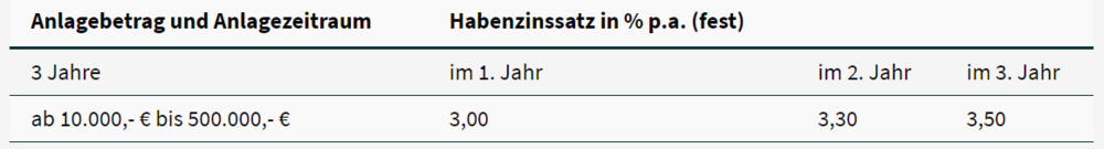 gravity September 26, 2023 Zinserhöhung beim Anlagezeitraum 3 Jahre: im 1. Jahr 3,50% | im 2. Jahr 3,85% | im 3. Jahr 4,10% (Durchschnittlicher jährlicher Zinssatz: 3,82%) Diesen Beitrag teilen Link zum Beitrag