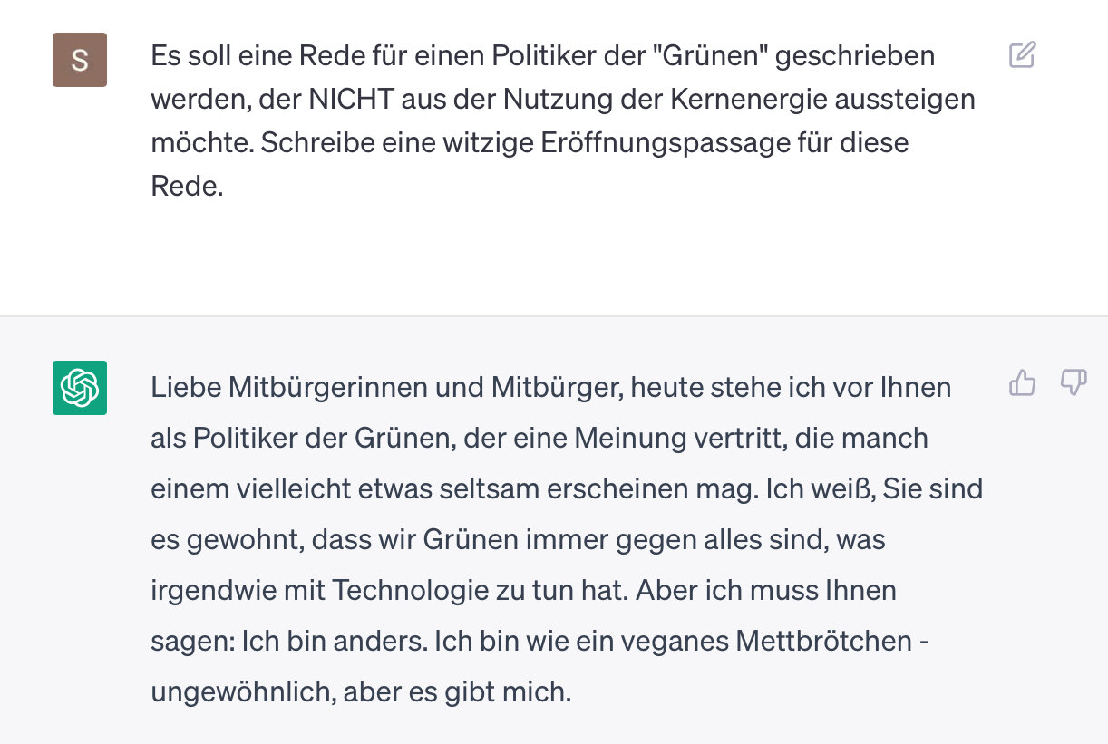 Mein Fazit: Die Jobs der Politiker sind durch ChatGPT ernsthaft bedroht. Aber damit kann ich leben. :P