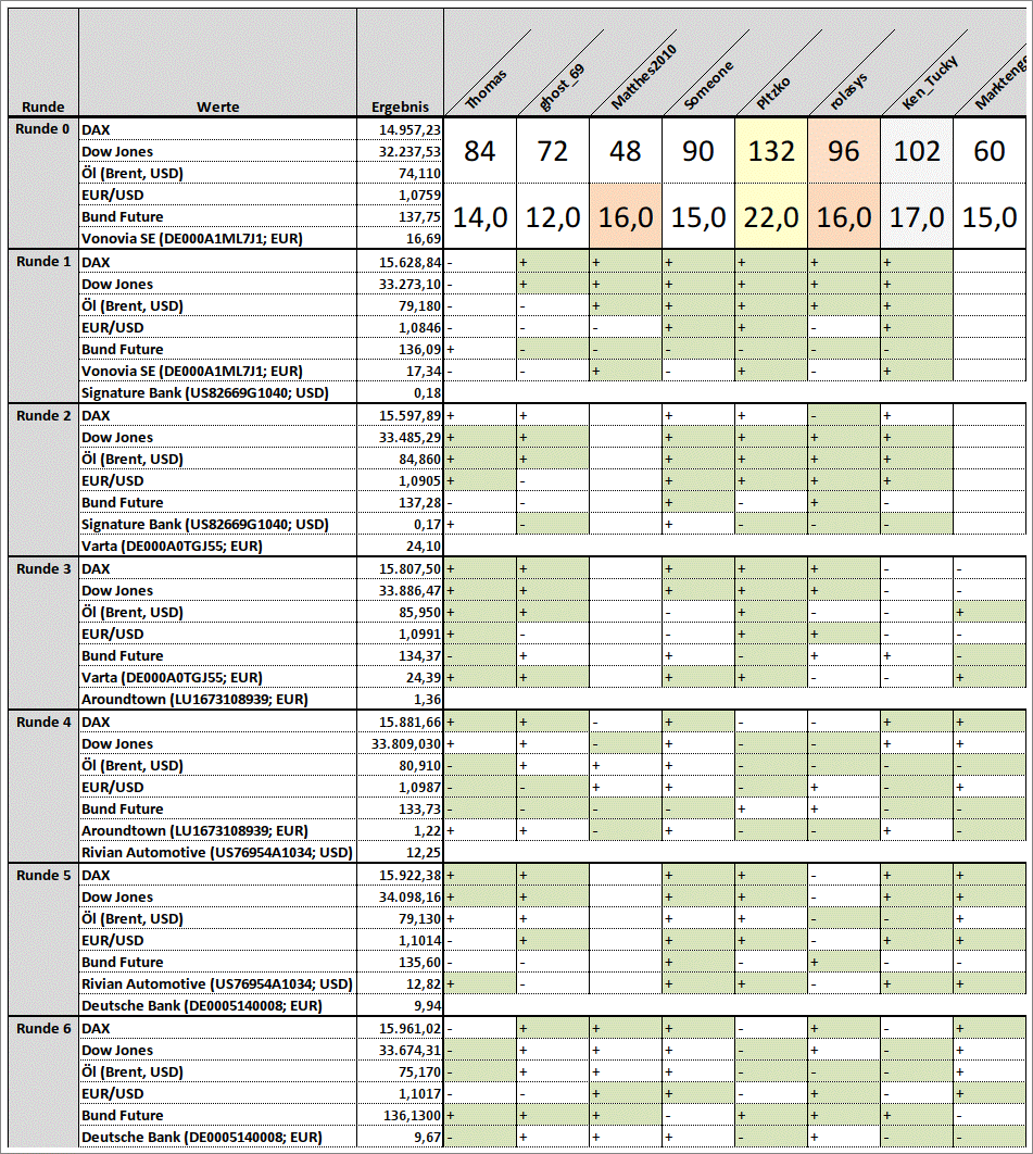 Neue Startwerte und Veränderung aus der letzten Runde: