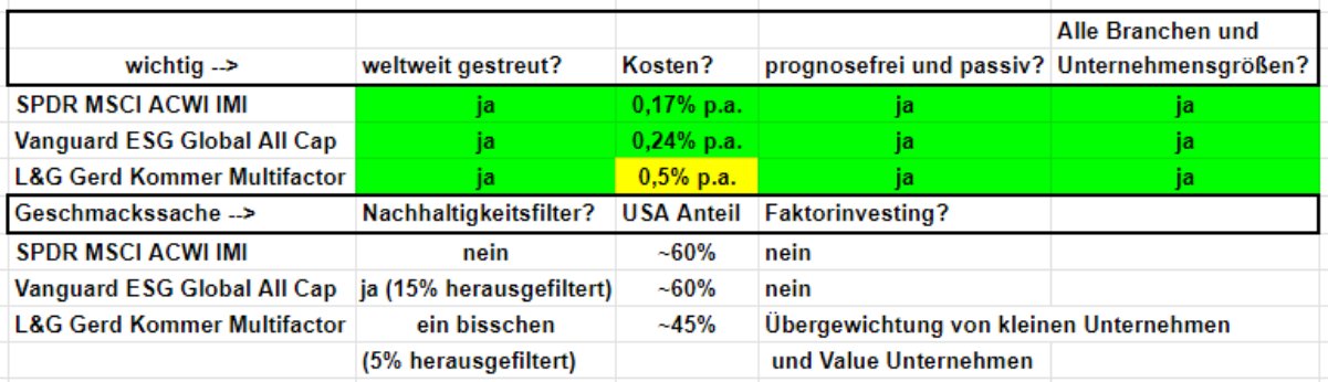 Kürzlich habe ich für einen Freund das Ganze auch mal probiert auf das wesentliche einzudampfen um ihn bei der Auswahl nach einer 1-ETF Lösung für den risikoreichen bzw. Aktienanteil zu unterstützen: