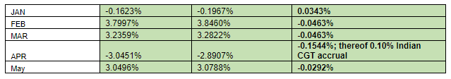 Ich habe Ihnen die Monate Jan – März gesendet, weil die zukünftige Tracking Difference in diesem Bereich liegen wird. Es gab im April eine einmalige Korrektur wegen der indischen Kapitalertragssteuer – das muss nachträglich einmalig gemacht werden (Details siehe unten).
