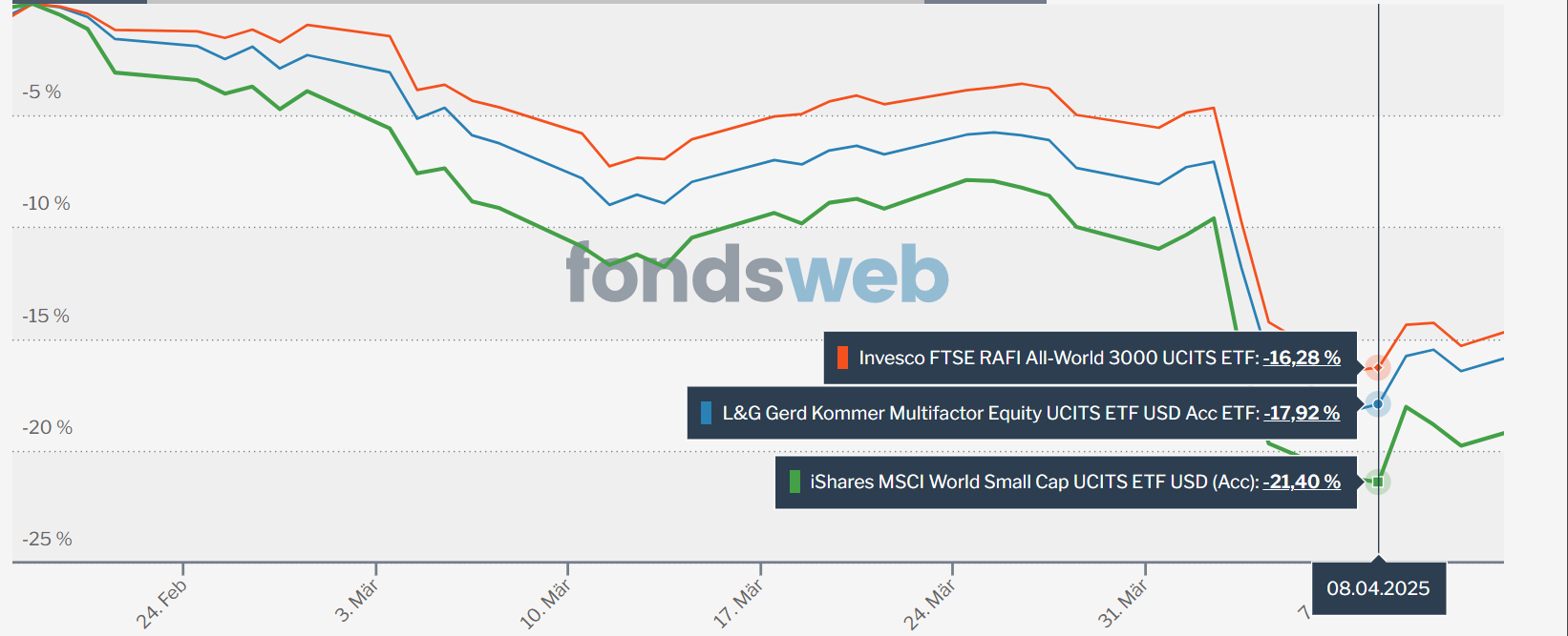 Das ist ja mein Punkt. Wenn dem so wäre, dann hätte er doch gerade in diesem Jahr sehr deutlich outperformen müssen, was ich versucht hatte, explizit mit der Phase bis zum 08.04. darzustellen. Hier sind ja tatsächlich nur die USA gefallen. Hat er aber nicht. Woran liegt das? Wahrscheinlich, weil der ETF einfach zu viel will und man sich andere Risiken und Probleme mit dem ETF reinholt. Wer weniger USA will, kann das sicher einfacher, ich persönlich frage mich ja, warum es noch immer keinen ACWI ex USA bei uns gibt. Nach meinen Wissensstand hat übrigens auch der RAFI Small Cape dabei, so dasss das Argument, die schlechte Performance des Kommer ist auf den Anteil der Small Cape zurück zu führen, wohl auch nicht zieht.