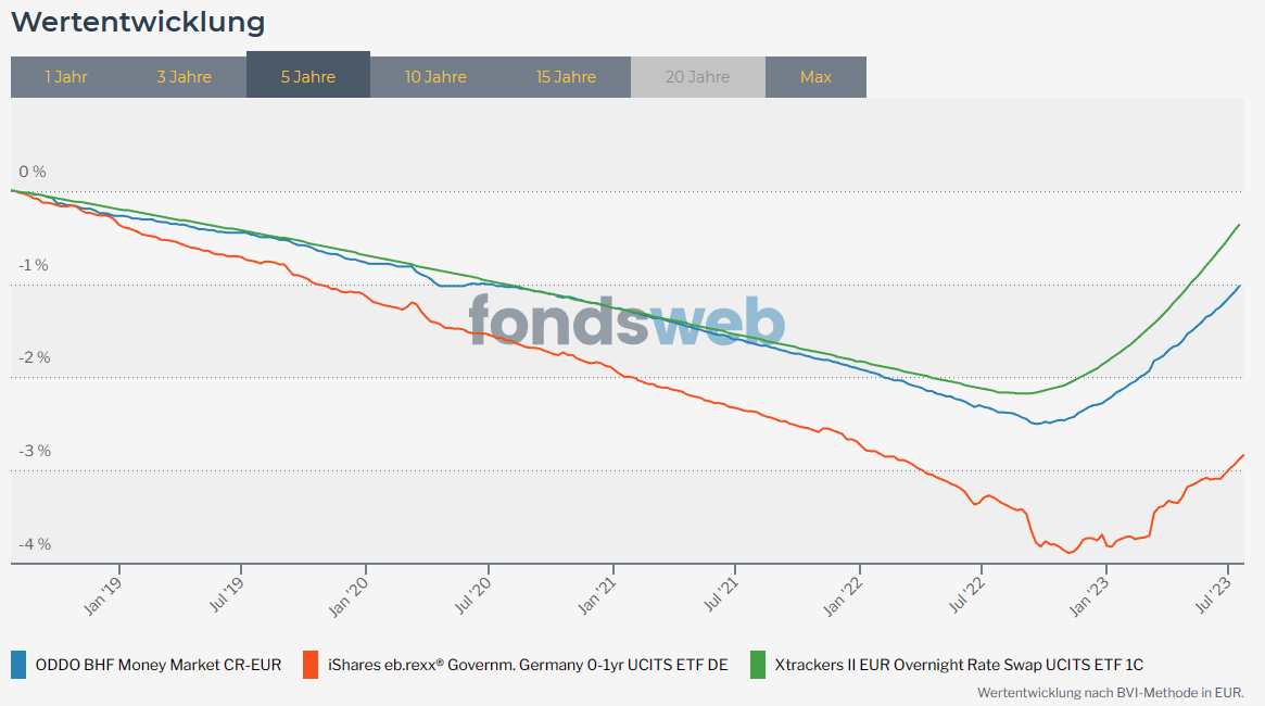 tfhb Juli 25, 2023 · bearbeitet Juli 25, 2023 von tfhb Hinsichtlich des Risikos von Kursschwankungen ist der iShares eb.rexx® Governm. Germany 0-1yr UCITS ETF DE auf jeden Fall schlechter als aktive oder passive Geldmarktfonds. Gibt halt leider keinen ETF auf Deutsche Staatsanleihen mit durchschnittlicher Restlaufzeit 3 Monate. Wer Lust hat, kann natürlich alle 3 Monate eine neue Bundesanleihe kaufen. Ich persönlich würde mir bei großem Sicherheitsbedürfnis lieber sowas wie den ODDO BHF kaufen, der aktuell zu 81,3 % AAA und zu 18,7 % AA Anleihen hält. Mit dem Risiko, dass mit dem Fonds mein Geld weg ist, während die Bundesanleihen noch bedient werden, kann ich (!) aufgrund der bis dahin geringeren Schwankung und höheren Rendite im Vergleich zu Fondslösungen allein mit Bundesanleihen leben. Wenn jemand aber nur mit 100 % AAA Anleihen ruhig schlafen kann, sollte er auch nur die kaufen. Diesen Beitrag teilen Link zum Beitrag