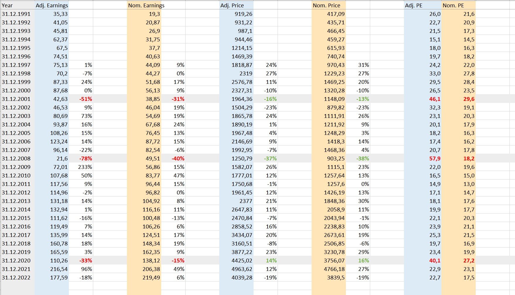 Earnings bzw. KGV vom S&P 500