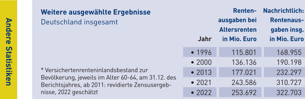Wenn es keine Inflationsanpassung dieser Zahlen gab, dann sind die Rentenausgaben insg. von 1996 bis 2022 nur um 2,52% p.a. gestiegen, also das ist dann ~Inflationsausgleich.