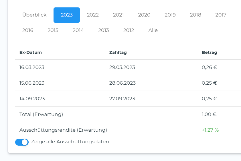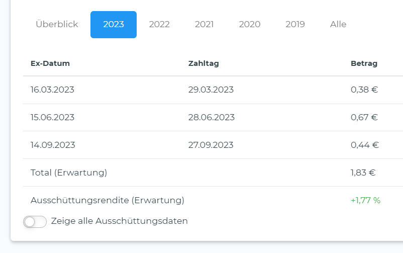 Hicks&Hudson November 17, 2023 Hier noch der Vanguard S&P500 bei JustETF: https://www.justetf.com/de/etf-profile.html?isin=IE00B3XXRP09&from=search#ausschuettungen Auch dort eher das, was Sapine berechnet hat. => ExtraETF ist für die Tonne und das nicht zum ersten Mal. Deren YTM-Angaben bei Anleihe-ETFs war auch schon immer falsch/Mist. Diesen Beitrag teilen Link zum Beitrag