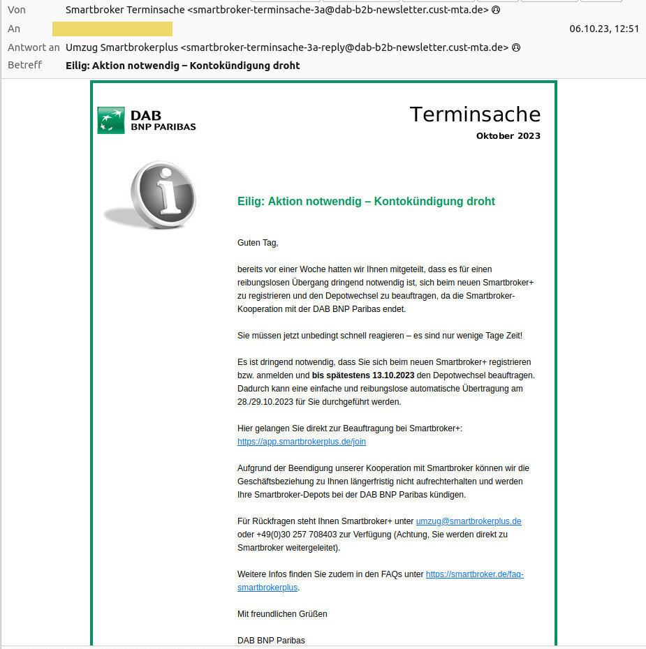 Man muss auch sagen, dass die letzte Information, die von der DAB selber hierzu kam, die folgende Email ist, in der tatsächlich schwarz auf weiß steht "Wir [...] werden Ihre Smartbroker-Depots bei der DAB BNP Paribas kündigen.". (Der Smartbroker CEO kann ja viel erzählen, wenn der Tag lang ist ...).
