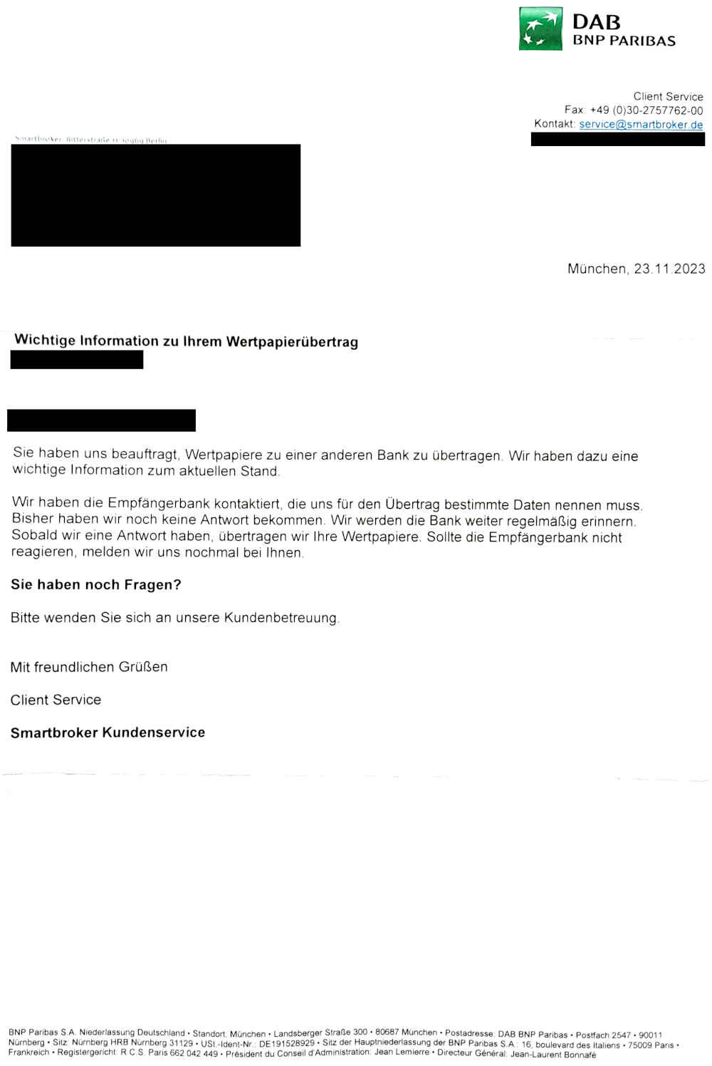 Betreffend dem noch laufenden Übertrag vom 04.10.2023 kam heute die Bestätigung zu meiner Anschuldigung der Baader von der DAB per Post.