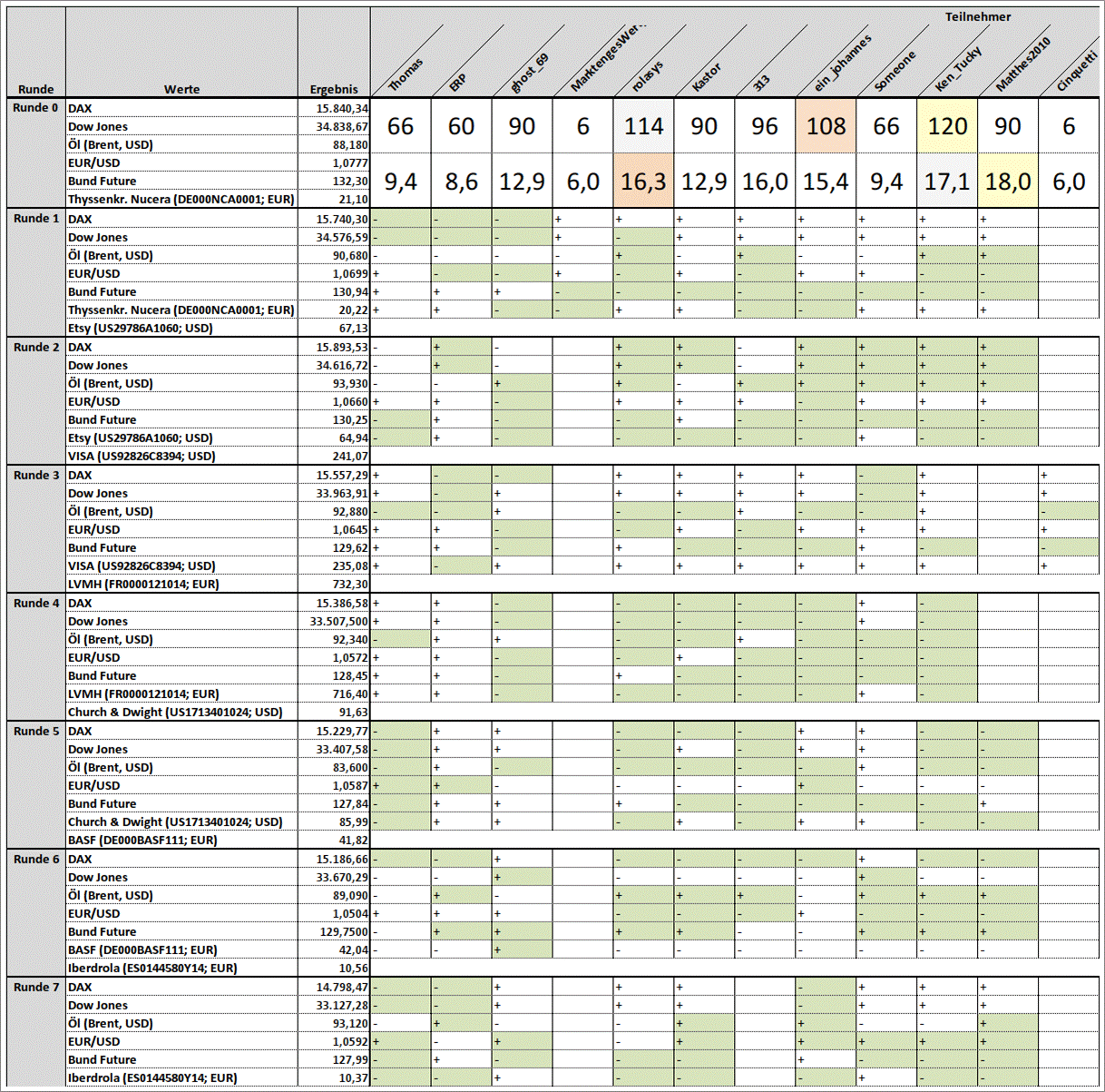 Thomas Oktober 21, 2023 · bearbeitet Oktober 22, 2023 von Thomas Hallo zusammen, eine weitere Börsenwettrunde beginnt. Viel Spaß beim Wetten. Tippabgabe bis Montag 17:00 Uhr --> 8. Runde von 11 Runden. Neue Startwerte und Veränderung aus der letzten Runde: 1. DAX: 14798,47 (-) 2. Dow Jones: 33127,28 (-) 3. Öl (Brent, USD): 93,12 (+) 4. EUR/USD: 1,0592 (+) 5. Bund Future: 127,99 (-) 6. Iberdrola (ES0144580Y14; EUR): 10,37 (-) 6. (Neu) Adyen (NL0012969182; EUR): 681,8 Informationen: Erst Tippabgabe! Danach können weitere Beiträge verfasst werden. Anders herum wird disqualifiziert! Die ersten 5 Werte stehen während der ganzen Tippsaison fest. Der 6. Wert wechselt von Runde zu Runde. Vorschläge für einen 6. Wert werden jederzeit entgegengenommen. Es dürfen jederzeit auch neue Spieler einsteigen und sich am laufenden Spiel beteiligen. Regeln: https://www.wertpapier-forum.de/topic/1420-fragen-zur-börsenwette-hier-rein/ https://www.wertpapier-forum.de/topic/368-regeln-und-informationen-für-die-börsenwette/ Bitte die Tipps im vorgegebenen Format abgeben! So sieht der richtige Code als Beispiel aus: [hide ] (hier das Leerzeichen noch entfernen vor "]") 1. + 2. - 3. - 4. + 5. + 6. - [/hide] Mein Tipp: Schon mal besser (für mich :D) Versteckter Inhalt Du kannst den versteckten Inhalt sehen, sobald du auf dieses Thema antwortest. Diesen Beitrag teilen Link zum Beitrag