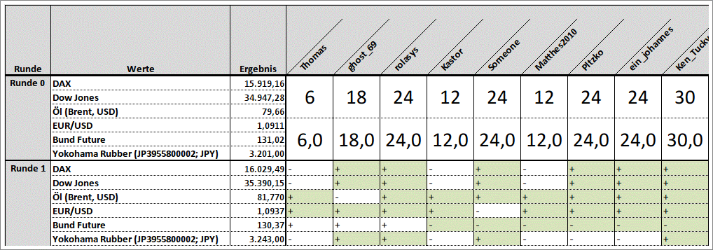 Neue Startwerte und Veränderung aus der letzten Runde: