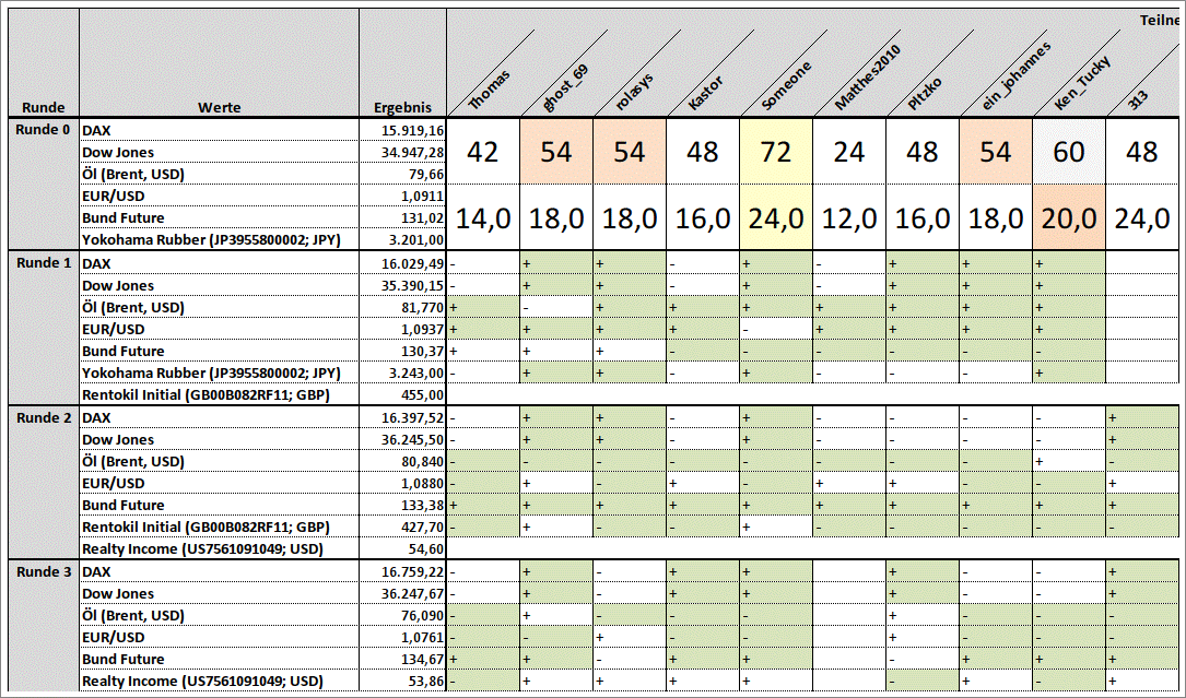 Thomas Dezember 8, 2023 Hallo zusammen, eine weitere Börsenwettrunde beginnt. Viel Spaß beim Wetten. Tippabgabe bis Montag 17:00 Uhr --> 4. Runde von 11 Runden. Neue Startwerte und Veränderung aus der letzten Runde: 1. DAX: 16759,22 (+) 2. Dow Jones: 36247,67 (+) 3. Öl (Brent, USD): 76,09 (-) 4. EUR/USD: 1,0761 (-) 5. Bund Future: 134,67 (+) 6. Realty Income (US7561091049; USD): 53,86 (-) 6. (Neu) Nippon Telegraph (JP3735400008; JPY): 170,5 Informationen: Erst Tippabgabe! Danach können weitere Beiträge verfasst werden. Anders herum wird disqualifiziert! Die ersten 5 Werte stehen während der ganzen Tippsaison fest. Der 6. Wert wechselt von Runde zu Runde. Vorschläge für einen 6. Wert werden jederzeit entgegengenommen. Es dürfen jederzeit auch neue Spieler einsteigen und sich am laufenden Spiel beteiligen. Regeln: https://www.wertpapier-forum.de/topic/368-regeln-und-informationen-für-die-börsenwette/ Fragen: https://www.wertpapier-forum.de/topic/1420-fragen-zur-börsenwette-hier-rein/ Bitte die Tipps im vorgegebenen Format abgeben! So sieht der richtige Code als Beispiel aus: [hide ] (hier das Leerzeichen noch entfernen vor "]") 1. + 2. - 3. - 4. + 5. + 6. - [/hide] Mein Tipp: Versteckter Inhalt Du kannst den versteckten Inhalt sehen, sobald du auf dieses Thema antwortest. Diesen Beitrag teilen Link zum Beitrag