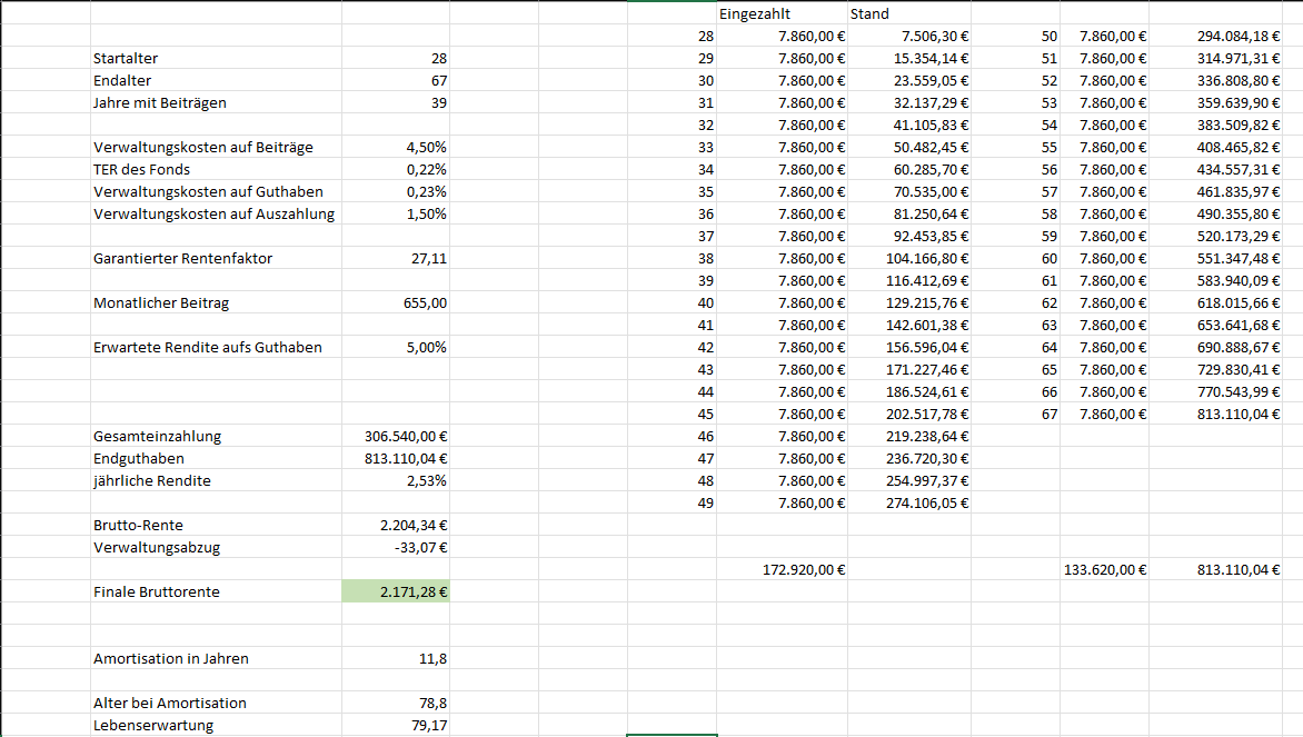 Weiß ich noch nicht, was ich davon halten soll. Erstmal ist 2171€ aus 5/10 Beitrag (also aktuell 655€) an sich nicht verkehrt. Dafür braucht es eben aber dann auch die sicheren 5% Rendite im Jahr und ich habe ein paar 100€ Verlust, da ich ja anstatt der GRV das Versorgungswerk wähle.