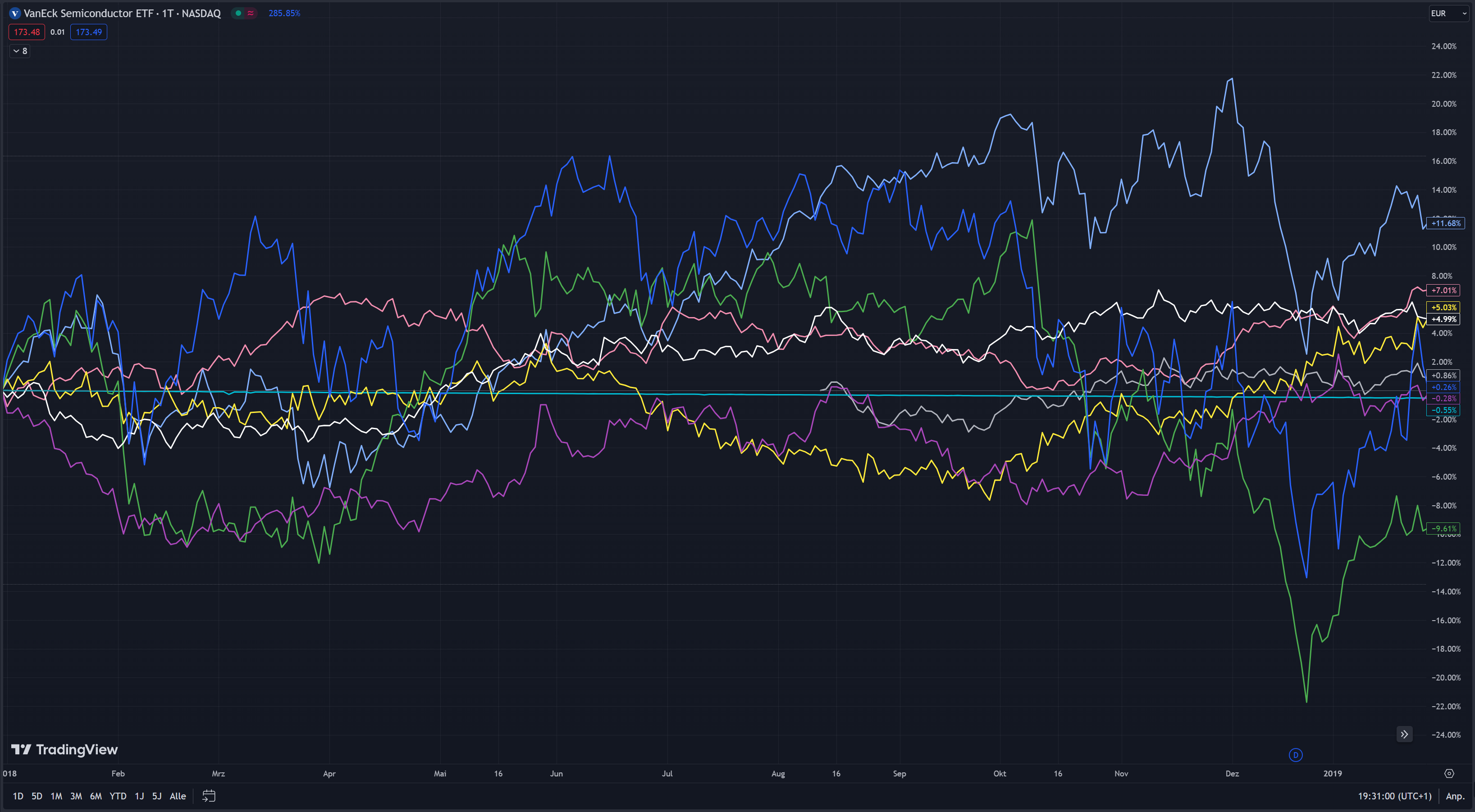 Collinz Dezember 20, 2023 · bearbeitet Dezember 20, 2023 von Collinz vor 42 Minuten von Michael82: Hier noch der Vollständigkeit halber das bereits mehrfach genannte Jahr 2018. Auch dies kann sich jederzeit so, oder schlimmer, wiederholen. Trades: 42 Gewinner: 13 Verlierer: 29 Performance am 31.12.18: -28,71% Depottief: Im Dezember bei -30,58% Ich bin jetzt manuell im Chartverlauf in EUR und mit meinen 8 Sektoren 2018 durchgegangen und zähle insgesamt 23 Trades. Dir fehlt im Februar und März-Mai, dass du auf die 25-jährigen EUR Staatsanleihen X25E wechselst. Außerdem korreliert dein XLK zu sehr mit dem XLV im Chart. Ich verwende daher anstatt dem XLK den SMH, da dieser im Tech-Bereich einen stärkeren Trend einschlägt. Auch hier wieder: USD/EUR returned +4.6% in 2018 Frage an die Community: gibt es 2018 einen Sektor/Asset der sich dauerhaft nach oben absetzen konnte? Diesen Beitrag teilen Link zum Beitrag