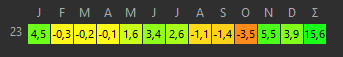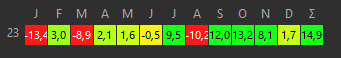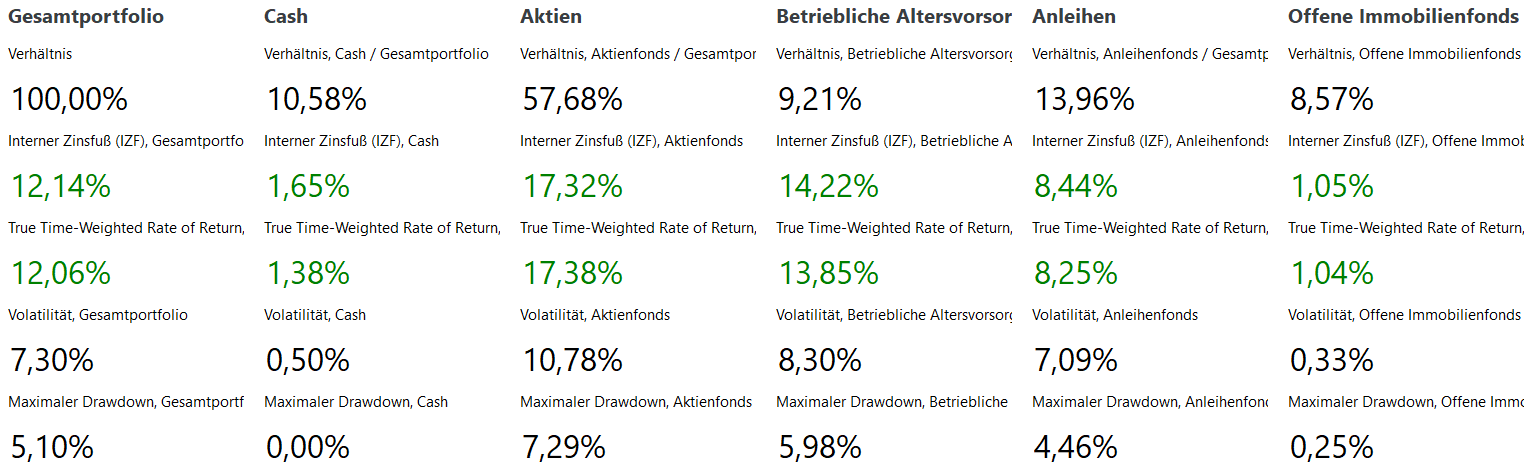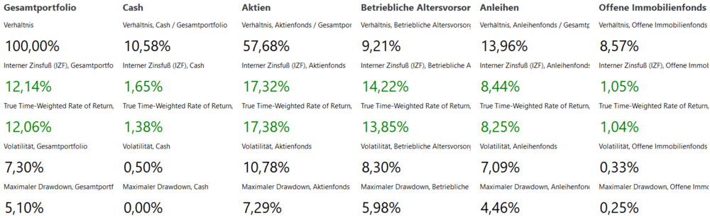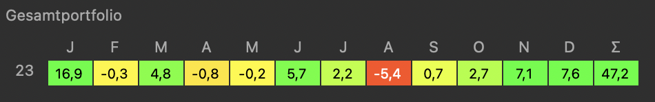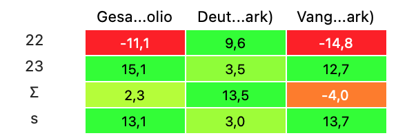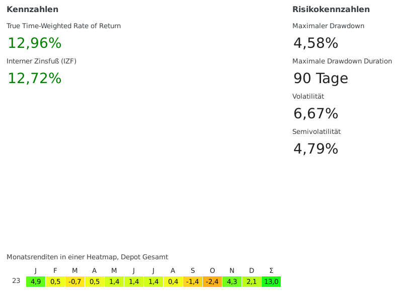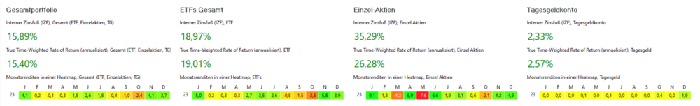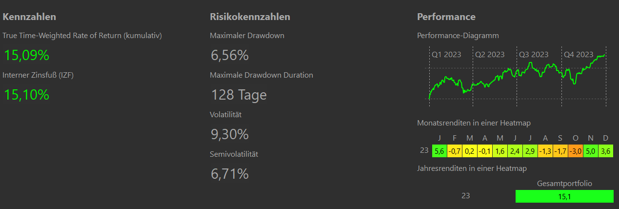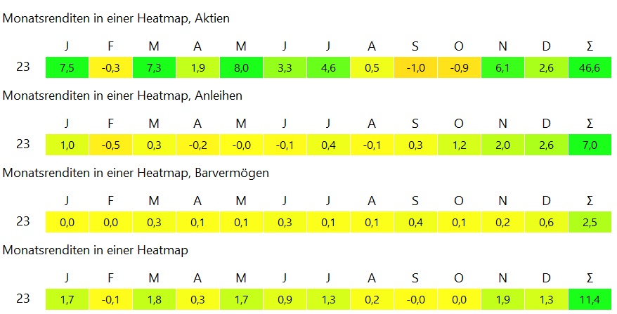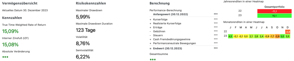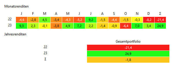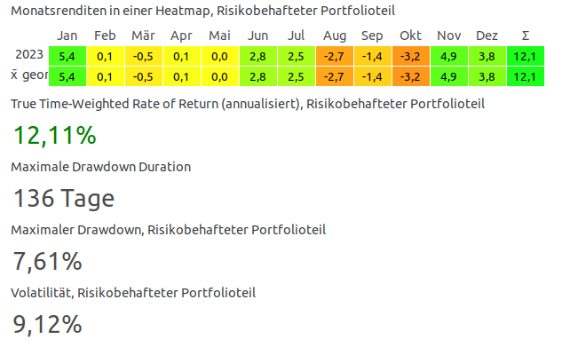 Merol Rolod Dezember 31, 2023 · bearbeitet Dezember 31, 2023 von Merol Rolod 2023 war vermögenstechnisch ein gutes Jahr. Der Endbetrag ist ein ordentliches Stück höher als der Startbetrag. Die Kennzahlen für das Gesamtportfolio sehen laut Portfolio Performance folgendermaßen aus: TTWOR: 6,03 % IZF: 6,18 % Max. DD: 7,43 % Vol.: 8,83 % Sem.-Vol.: 6,27 % Die Aufteilung ist 10 % RK1 und 90 % riskanter bis hin zu Einzelaktien. Letztere sind der Grund für die reduzierte Performance, wie die folgenden Heatmaps zeigen. Welt-ETFs Länder-ETF Einzelaktien Diesen Beitrag teilen Link zum Beitrag