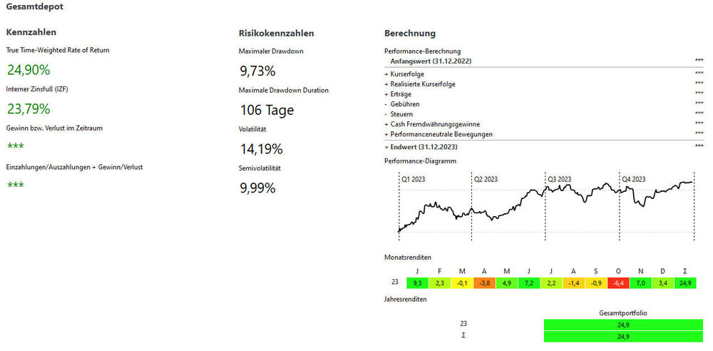 Peter127 Dezember 31, 2023 Am 2.1.2023 um 09:57 von Peter127: Gesamt tiefrot: -17,1% Aktienanteil -12,8% Krypto -76,6% Bonds -7,5% Aufteilung aktuell ca 70% Aktien/Fonds 10% OIFs 5% Bonds 5% Krypto 10% TG/FG/AAA 2023 kann nur bergauf gehen :-) .. und es ging bergauf :-) Gesamtdepot (inkl. Cash/TG): 15,3% (TTWROR) - Aktienanteil: 14,9% - HY/EM Bonds: 7,3% - OIF: 2,1% - Krypto: 84,2% Performancetechnisch war USA mal wieder dominierend. EM & PAC zum x-ten mal am hinteren Ende aber zumindest noch positiv. Absoluter Loser war China (CSI) mit knapp -17%. Erfreulich auch die Entwicklung der Neuqen Anleihe mit ca 28%. Krypto: bleibt ein Zock Depotaufteilung aktuell ca. - 69% Aktien/Fonds - 8% HY/EM Bonds - 9% Krypto - 14% TG/FG/AAA Größere Änderungen in 2023: Auflösung BSV und Rückgabe OIFs an KAG -> der hohe Abschlag an der Börse ist so langsam nicht mehr witzig. Umschichtung in HY- und AAA-Bonds. Noch einiges Zockergeld in Krypto gepackt. Diesen Beitrag teilen Link zum Beitrag