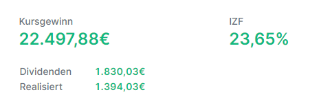 finisher Dezember 30, 2023 ETF-/Aktiendepots inkl. Anleihen, Festgeld, Tagesgeld: +13,77% Berechnet mit XINTZINSFUSS (XIRR) Abzüglich 6,1% Inflation sind es 7,67% real. Diesen Beitrag teilen Link zum Beitrag