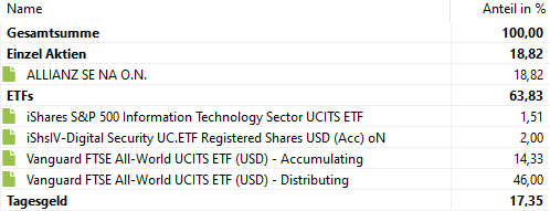 bejoer Dezember 30, 2023 · bearbeitet Dezember 30, 2023 von bejoer Performance 2023 Aufteilung Allianz sind MA-Aktien mit AG-Zuschuss und einer Sperrfrist von 3 Jahren. Freie Anteile werden jährlich in den All-World umgeschichtet. Digital Security ETF war etwas Spielerei und wird aber in S&P500 IT umgeschichtet, Dienen als Satellit. Für 2024 werden ich den Aktienanteil auf 90% erhöhen. Diesen Beitrag teilen Link zum Beitrag