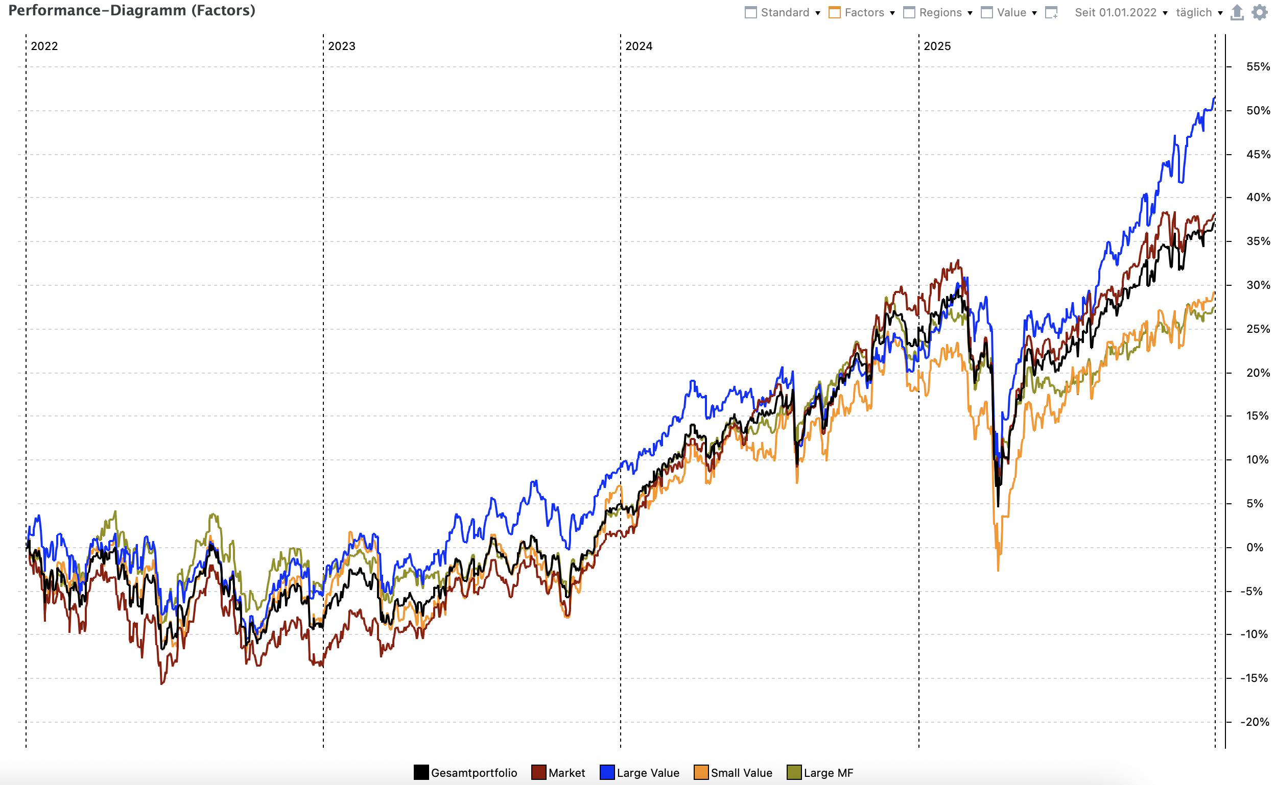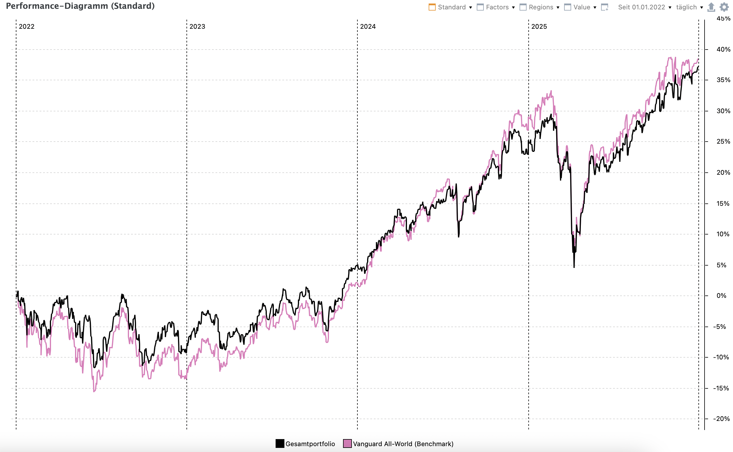 i++ März 14, 2025 · bearbeitet März 14, 2025 von i++ Wie haben sich nun die beiden Depots von Anfang 2022 bis Ende 2024 entwickelt? Am Jahresanfang investiere ich in beide (virtuellen) Depots 50.000€ Cash und führe ein Rebalancing auf die ursprüngliche Gewichtung (siehe Beitrag 1) durch. Evtl. anfallende Steuerzahlungen ignoriere ich dabei. Depot 1: Die risikoadjustierte Rendite ist gegen die Benchmark ähnlich, wobei Depot 1 eine niedrigere Rendite und etwas weniger Risiko hat. Stand Heute (2025) hat Depot 1 die Benchmark eingeholt, mit etwas weniger Risiko: Depot 2: Anfang 2025 habe ich die 3 bisherigen Small-Cap-Value ETFs gegen den neuen Avantis Global Small Cap Value ETF (IE0003R87OG3) getauscht. Für Depot 1 habe ich keine Änderungen in der Aufteilung vorgenommen, da ich dieses auch als Benchmark für mein Echtgelddepot verwende (hat eine ähnliche Factor- u. Regionen-Aufteilung, aber mehr Positionen): Damit ergibt sich nun ca. folgende Aufteilung der Weltregionen: Depot 2 hat eine etwas bessere Rendite wie die Benchmark und schlägt diese auch in der risikoadjustierten Rendite: Stand Heute (2025) hat Depot 2 die Benchmark überholt, mit weniger Vola: Diesen Beitrag teilen Link zum Beitrag