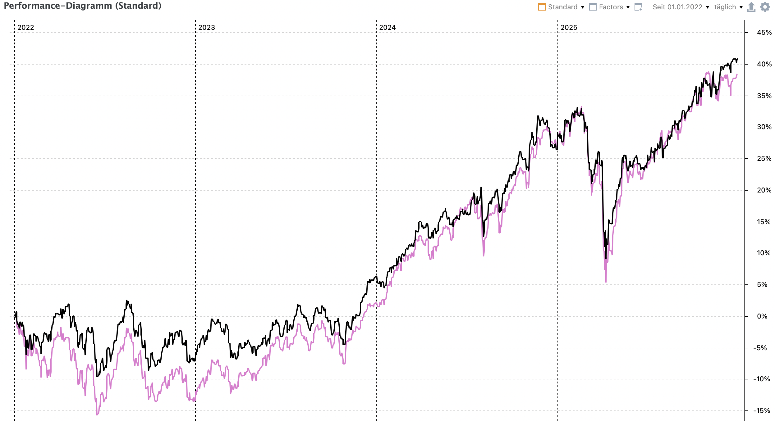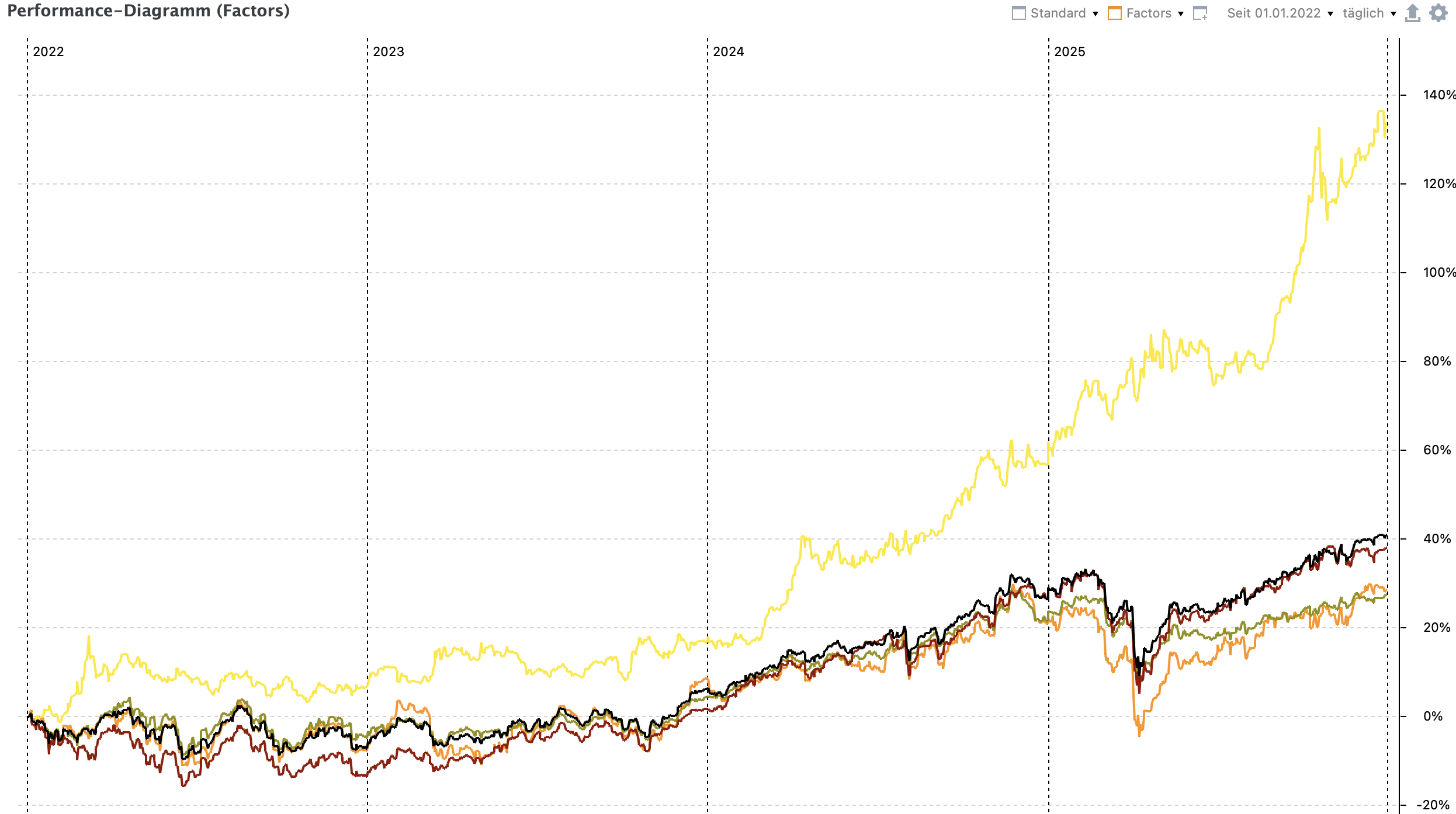 i++ Dezember 31, 2025 Und alle Jahre wieder ein paar bunte Bildchen . Beide Depots haben 2025 die Benchmark (bei niedrigerem Risiko) geschlagen (+11,6% u. +11,4%, Benchmark {All-World ETF} +9,2%). Depot 1 Depot 2 Diesen Beitrag teilen Link zum Beitrag