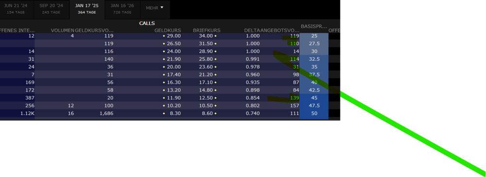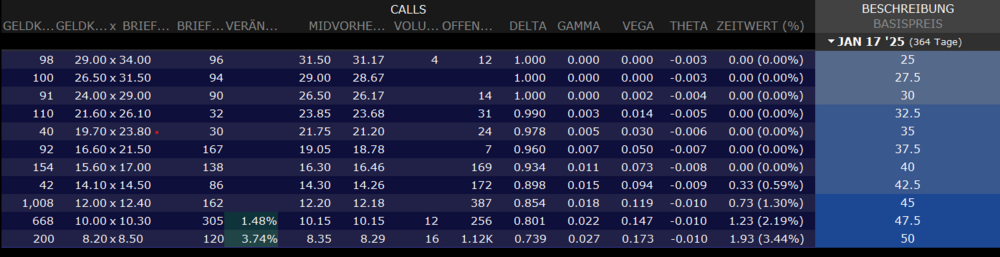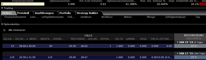 DividendHiker Januar 19, 2024 vor 13 Minuten von B.Axelrod: Kauf 100 Aktien Realty Income ("O") - für $5630 Verkauf CALL Januar 2025 Strike 27,50 . Geld 26,50 Brief 31,50 - Ausführung dürfte bei $28 oder niedriger liegen, da kein Open Interest Der Dividendenertrag beträgt $0,25 pro Monat - also ca. $2,80 im Jahr (11 Ausschüttungen). Der Wert der Option bei heutigem Verfall liegt bei $28,60 zu $30,00- Du wirst aber wahrscheinlich keine Ausführung deutlich unter $30 bekommen. Zumal bei Zinssenkungen in USA die Aktien nach oben gehen dürfte, wie von November bis Mitte Januar, als die Zinssenkungsphantasie in den Markt kam und jetzt doch nicht so schnell und oft kommen soll. Die verdoppelt sich tatsächlich- aber dafür hast Du am anderen Ende "kostenlos" 50% Aktienverluste. Danke Euch Allen für die interessanten Inputs. Wollt ihr mir etwas erzählen dass es keinen Free Lunch gibt? Und ja, lieber Axelrod, es gibt je nach Marktphase starke Begrenzungen in der Umsetzbarkeit (Open interest, Spreads...) . In der aktuellen Marktphase sind die idealtypisch von mir skizzierten 50% im Geld schwer. Ich würde keinen Strike wählen, bei dem es kein ausreichendes Open Interest gibt. Bei höheren Call Strikes ist es sogar aktuell fast ohne Vola im Markt umsetzbar, dann ist halt die Frage ob sich das Experiment für eine nur leicht erhöhte Dividende lohnt... Die kostenlosen 50% Aktienverlust für den Modellfall gibt es aber ja eben dann nicht, wenn (1) ich sie mit der Call Prämie steuerlich verrechnen darf und (2) die Call Prämie über dem inneren Wert (=Aktienverlust) liegt. Daher unvermindert mein großes Interesse an einer Lösung für Problem 3. Verrechnung Aktienverluste und Optionsgewinne evtl. durch Zusatzgeschäft oder andere Lösung zu kompensieren. Die kostenlosen 50% Diesen Beitrag teilen Link zum Beitrag