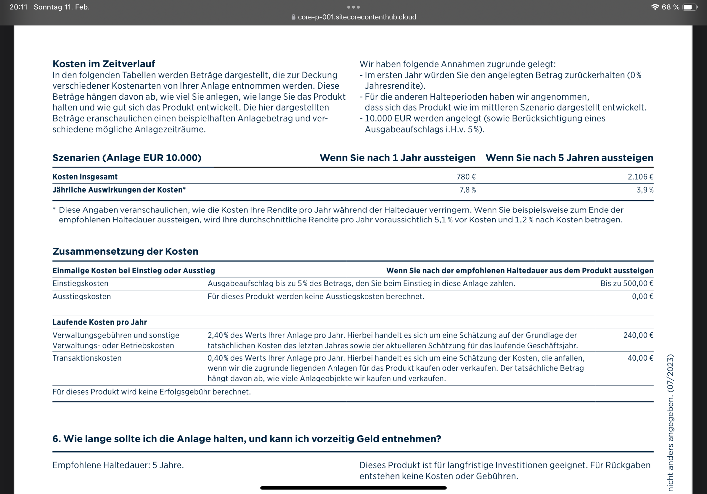 satgar Februar 11, 2024 · bearbeitet Februar 11, 2024 von satgar vor 16 Minuten von Fondsanleger1966: Ja. Es ist so, wie @Mvp es oben beschreibt. Die Rendite-Angabe ist immer nach allen Kosten außer den anlegerbezogenen wie Depotgebühr, AA, Börsenhandelsgebühr usw. Eine Besonderheit bei OIF ist allerdings, dass die Kosten von Immobilien-Transaktionen meistens höher sind als die für Wertpapier-Transaktionen. Aber das ist schon von der Rendite abgezogen. Ein relevanter Punkt könnten die latenten Steuern sein. Da kenne ich den aktuellen Stand aber nicht. Das Basisinformationsblatt weist dazu übrigens auch gute Daten aus, allerdings berücksichtigt dies auch 5% AA, die man heutzutage natürlich nirgendwo mehr bezahlen sollte. Laufende Kosten von insgesamt 2,8% inkl. transaktionskosten p.a. sowie eine Anlegerrendite nach Ausstieg nach der empfohlenen Haltedauer (5 Jahre) von 5,1% vor Kosten und 1,2% nach Kosten. Auf Internetseiten ließt man aber immer die 0,84% für den Hausinvest. Das find ich halt echt kacke. Von den 10.000€ und den 2106€ Gesamtkosten sind 500€ der Ausgabeaufschlag und 1506€ die laufenden Kosten in den 5 Jahren. Diesen Beitrag teilen Link zum Beitrag