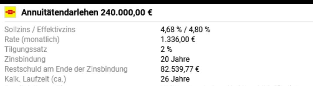 kopfsalat23 Februar 12, 2024 vor 7 Minuten von BlindesHuhn88: 240k für Immo mit 4,54% war im Oktober letzten Jahres.Aktuell bei 4,1%. 100k ungesichert geht nicht für 4,54% durch? Ich dachte wegen sehr viel geringeren Volumen würde es sich so ausgleichen. definiere "sehr viel geringer". Die Bank wird da vermutlich eine andere Vorstellung haben als du. Und darauf kommt es an. In Österreich (weiß nicht wie das in D ist), werden unbesicherte Konsumkredite an Leute wie dich und mich bis max 50k vergeben, entsprechende Bonität vorausgesetzt. Und der Zinssatz ist selbstverständlich auch höher als für eine Immobilienfinanzierung. LG Diesen Beitrag teilen Link zum Beitrag