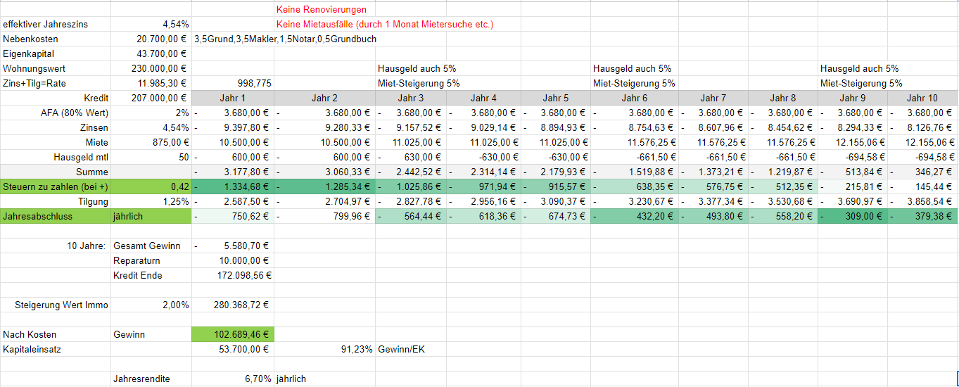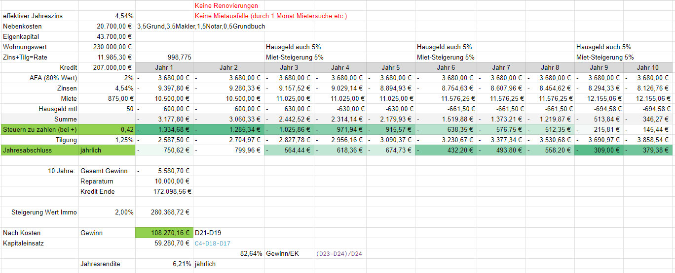 BlindesHuhn88 Februar 15, 2024 · bearbeitet Februar 15, 2024 von BlindesHuhn88 vor 8 Stunden von kopfsalat23: Du setzt hier offenbar den Effektivzinssatz mit Nominalzinssatz plus Tilgung gleich. Das stimmt nicht! Der Effektivzinssatz beinhaltet einfach auch Nebengebühren des Kredites, aber nicht die Tilgung! Die Tilgung kommt da noch obendrauf. Du musst in deiner Tabelle statt 3,29 die 4,54 eintragen. Eine Bruttomietrendite von über 4,5% wie in deinem Beispiel wäre in meiner Gegend übrigens unerreichbar, das kann bei dir natürlich anders aussehen. Hallo Kapfsalat23, danke! ist klar, aber vor lauter berechnen ist mir hier die Differenz reingerutscht! habe es umgeschrieben. ich finde es aber jetzt beunruhigend, dass ich jedes Jahr zur Wohnung Geld zu schießen müsste. Nur durch Mietsteigerungen komm ich etwas runter, aber durch den Abbau der Zinsen (durch Tilgung) sinkt auch meine Steuererstattung (auch durch höhere zu versteuernde Mieten) was wieder zu einem ansteigendem jährlichen Zuschuss führt !? D.h. aber dann dass sich diese Wohnung finanziell nicht trägt. Schon gar nicht wenn ich noch Reparaturen auf 10 Jahre höher als 10k€ habe. Trotzdem ist die Gewinn/EK Rate und jährliche Rendite besser als mit ETF ..... das soll noch einer verstehen -.- ja die Miete (östlich der A3 zwischen Regensburg und Passau ) wird aktuell so eingenommen. (Zahlen sind real von einem sehr engen Freund. Er hat mir hierzu quasi die realen Werte zur Verfügung gestellt und war auch am Ergebnis interessiert. gut dass er es noch nicht gesehen hat XD ) Diesen Beitrag teilen Link zum Beitrag