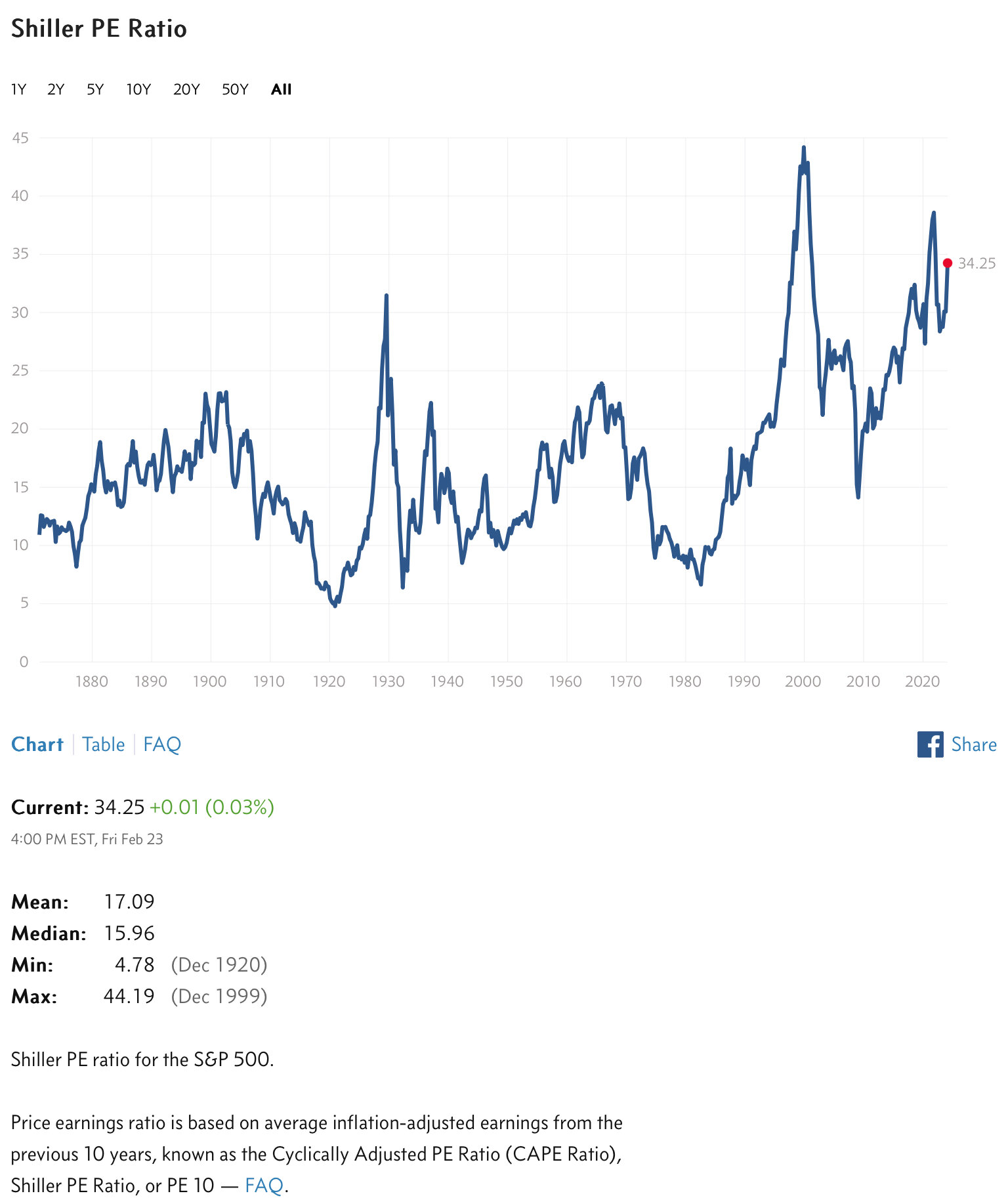 hattifnatt Februar 24, 2024 · bearbeitet Februar 24, 2024 von hattifnatt vor 14 Minuten von H7-25: https://www.gurufocus.com/economic_indicators/57/pe-ratio-ttm-for-the-sp-500 Vielleicht bin ich aber auch zu doof, die richtigen Daten zu finden und liege falsch Habe keinen GuruFocus-Account und nicht verstanden, ob der Wert von 19,x vs. die aktuellen 28,x das langjährige Mittel oder sonstwas war, aber deutlich höher ist der aktuelle Wert schon. Man könnte auch auf das CAPE schauen, das liegt mit 34,25 gut doppelt so hoch wie der langjährige Durchschnitt von 17,09: https://www.multpl.com/shiller-pe Diesen Beitrag teilen Link zum Beitrag