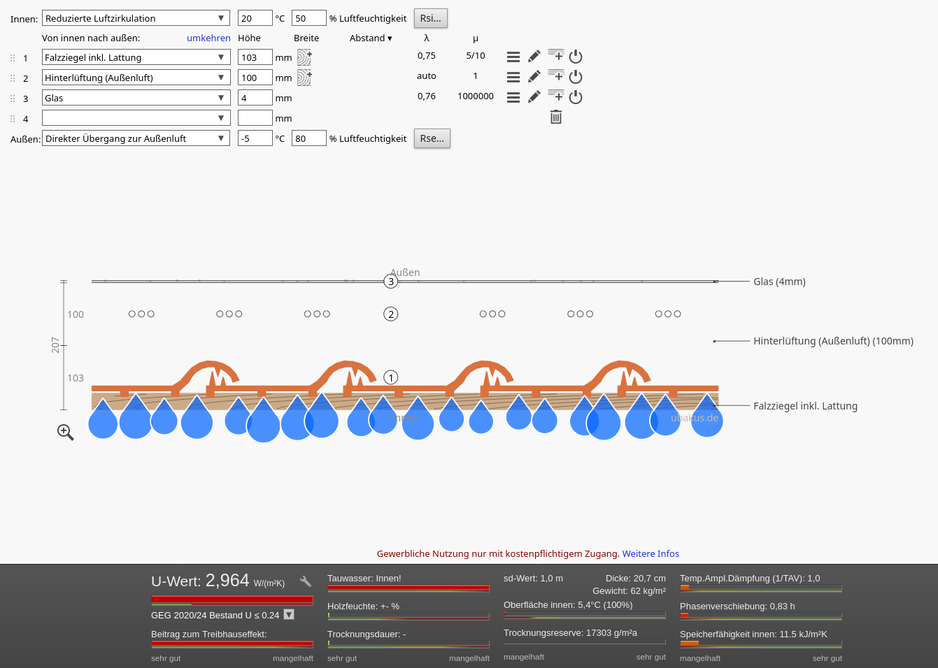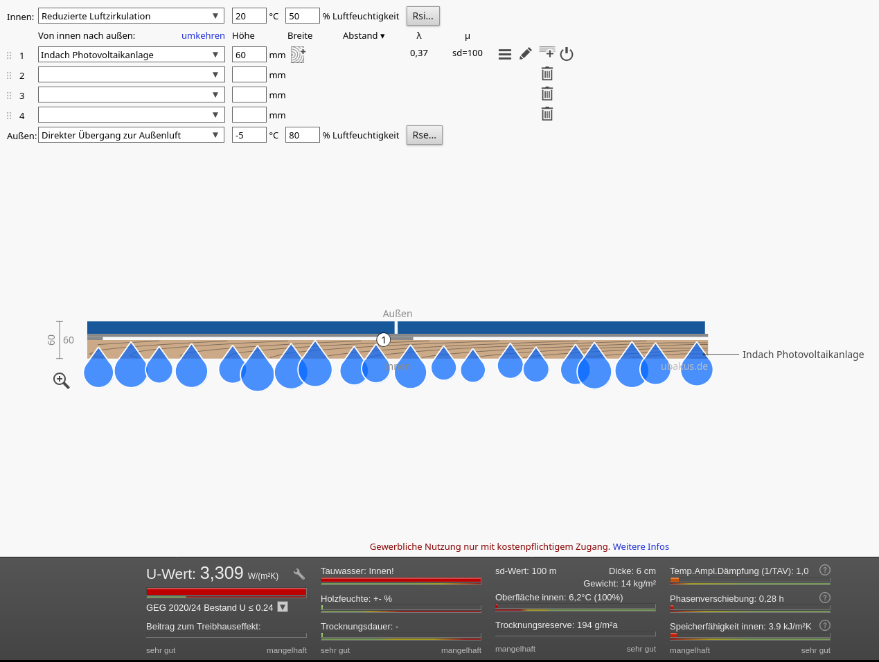 reko August 27, 2024 · bearbeitet August 27, 2024 von reko @oktavianIch wollte nur das prinzipielle Vorgehen zeigen. Es kommt natürlich auf den konkreten Aufbau an. Hätte ich statt Falzziegel ein Trapezblech genommen sähe es anders aus. In Ubakus kann man den Einfluß von Änderungen sehr gut sehen. Generell ist der Dämmeffekt eines Solardachs gering. Diesen Beitrag teilen Link zum Beitrag
