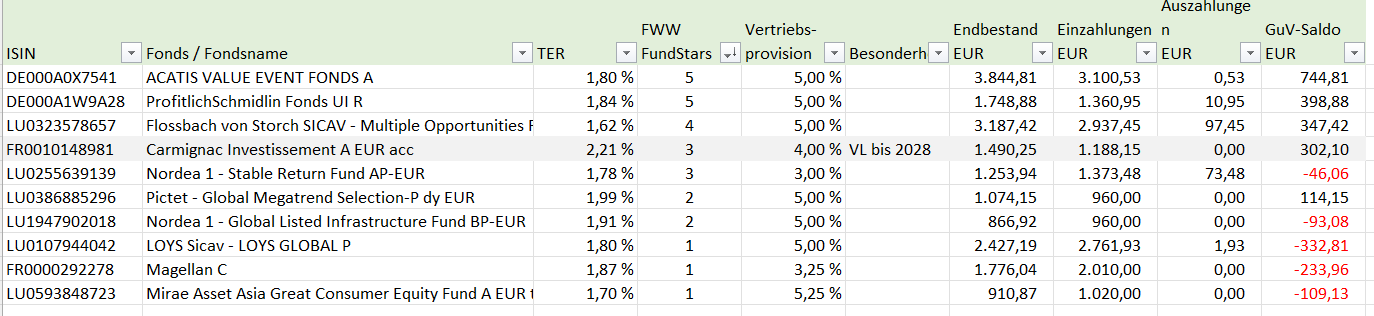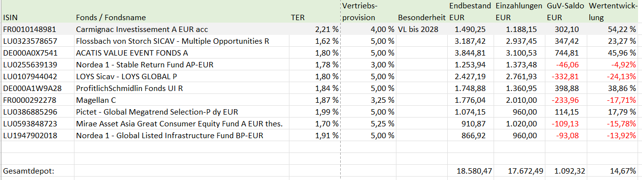Stabsauger Februar 24, 2024 · bearbeitet Februar 24, 2024 von Stabsauger Hallo zusammen, ich bin neu in diesem Forum und würde mich über Hilfe zu meinem folgenden Anliegen freuen. Ich schreibe allerdings erst einmal ein Bisschen etwas über meine Situation. Das hilft hoffentlich etwas bei der Einordnung Zu mir bisher: Ich habe seit 2015 eine Ausbildung absolviert und daran anschließend noch studiert. Während der Berufsausbildung hat mich ein Bekannter, welcher für einen Strukturvertrieb tätig ist, überredet einen Fondssparplan bei der FNZ (vormals ebase) anzulegen. Das habe ich dann auch mit einer von ihm vorgeschlagenen Fondsauswahl getan und seitdem bespart. Vor zwei oder drei Jahren wurden dann auf seinen Vorschlag hin die Beiträge erhöht und teilweise in andere Fonds eingezahlt. Momentan liegen dort ca. 18.500 €. Nun habe ich seit letztem Jahr mein Studium abgeschlossen und einen neuen Job. Seitdem beschäftige ich mich auch das erste Mal wirklich selbst mit meinen Finanzen. Schritt eins war die damals ebenfalls abgeschlossene BU durch eine neue, mit einem meiner Meinung nach besseren Gesamtkonzept, zu ersetzen. Nachdem ich im letzten Jahr aufgrund eines Umzugs nicht allzu viel Geld übrig war habe ich nun begonnen mich mit meinen Finanzen zu beschäftigen. Momentan bespare ich mit monatlich ca. 1000€ einen Notgroschen. Dieser beträgt Stand heute ca. 6000€ und lag bisher auf einem Tagesgelkonto mit 2,75% Zinsen. Seit einigen Tagen liegt das Geld mit 4% bei einem Neobroker auf dem Verrechnungskonto (Außschließlich wegen der Zinsen). Außerdem habe ich ein Depot bei einem zweiten Neobroker, bei welchem ich auch (eher unbeholfen) ein paar hundert € in Aktien investiert habe. Verpflichtungen habe ich im Grunde kaum. Lediglich mein Auto ist ziemlich alt (Restwert momentan an ca. 2000€). Ich denke hier werde ich in den nächsten drei Jahren ein anderes kaufen (ca. 20.000€). Das hängt allerdings auch davon ab, ob der jetzige nächstes Jahr noch vernünftig durch den TÜV zu bringen ist. Ich gehe aber davon aus. Dann gibt es erst in drei Jahren ein neues. Da aber ein Totalschaden durch Unfall oder Defekt nicht ausgeschlossen ist, hätte ich ganz gerne 10k bis 15k auf der Seite um im Notfall reagieren zu können. Mein Zukunftsplan ist mir ehrlich gesagt gerade nicht ganz klar. Ich denke aber, dass ich evtl. in 10 Jahren Wohneigentum erwerben möchte. Vielleicht mit meiner Freundin zusammen. Wenn Freundin weg, dann evtl. auch alleine. Das steht aber alles noch ziemlich in den Sternen. Ich möchte auf jeden Fall die nächsten 8-10 Jahre Vermögen aufbauen um mir Spielraum zu schaffen. Dazu will ich mich auch noch weiter mit Finanzen beschäftigen. Das folgende Anliegen scheint mir aber besser früh als spät betrachtet. Mein eigentliches Anliegen: Die Fonds bei der FNZ sind ziemlich teuer und auch von der Performance her nicht das gelbe vom Ei. Außerdem ist das alles recht kompliziert. Ich zahle quartalsweise noch 13,25€ Depotführungsgebühr sowie jährlich 12€ VL-Vertragsentgeld. Also in Summe 65€ p.A. Dann kommen noch die laufenden Kosten der Fonds dazu. Ich habe das Portfolio im Folgenden mal aufgelistet. Die Beträge sind von Depoteröffnung bis heute. Mir stellt sich jetzt die Frage, was ich mit diesen Fonds mache. Meine Idee ist, diese zu verkaufen (das kostet keine Gebühr) und per Neobroker in bspw. den "MSCI World Index" zu investieren. Diesen würde ich dann auch, wenn ausreichend Notgroschen vorhanden ist vorerst per Sparplan weiter besparen. Ich habe meinen Steuerfreibetrag noch nicht voll ausgeschöpft. Heißt ich würde einen Teil jetzt verkaufen und den anderen anfang nächsten Jahres. Erst wollte ich einen Teil des Geldes zum Notgroschen hinzufügen. Das würde allerdings meine zu versteuernden Zinserträge deutlich erhöhen und dann zum (Steuer-)Problem werden. Außerdem habe ich beim Einzahlen auch schon recht viel Gebühr bezahlt. Aber die bisher bezahlten Kosten werde ich wohl als Lehrgeld verbuchen müssen. Die anfallende Steuer wohl auch. Die VL-Leistungen bekomme ich nicht so einfach los, oder? Ich könnte sie jetzt allerdings erhöhen (wegen neuer Arbeitssttelle) und (so glaube ich zumindest) das Depot in ein reines VL-Depot umwandeln. Dann würden nur noch die 12€ VL-Vertragentgeld anfallen. Mich würde eure Meinung zu diesem Plan interessieren. Macht das Sinn? Was würdet ihr tun(vor allem mit den negativen Fonds)? Vielen Dank und Grüße Diesen Beitrag teilen Link zum Beitrag