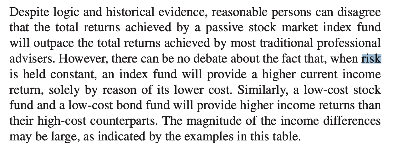 Soweit ich mich erinnern kann, hat J. Bogle mal tatsächlich auch gesagt/geschrieben, dass die hohen Kosten von aktiven Fonds ein Risiko sind.