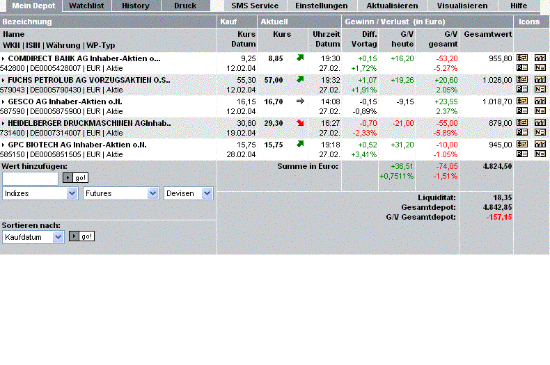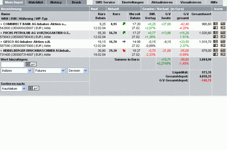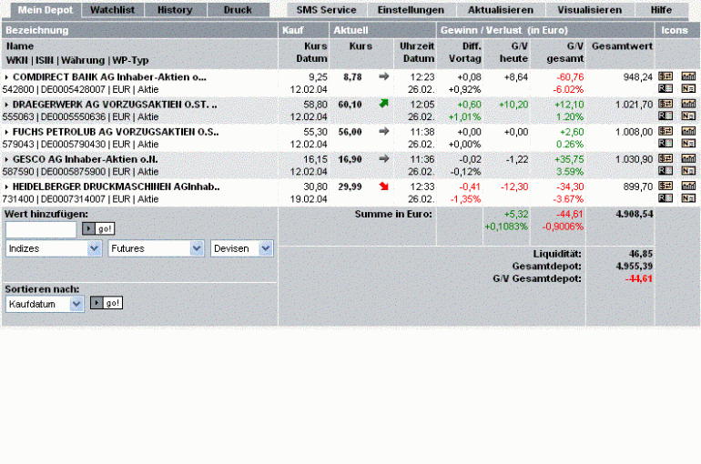 tron21 Februar 26, 2004 ok damit habt ihr mich überzeugt!!! das depot hat sich auch wieder etwas erholt......gestern war es noch ein minus von 122,74.......da sieht das von heute ja schon richtig lecker aus...... der einzige wert der mir sorgen macht ist comdirect......mit knapp 6% minus arbeitet er sich leider stabil auf den stoppkurs zu. aber noch ist er ja nicht da. Diesen Beitrag teilen Link zum Beitrag