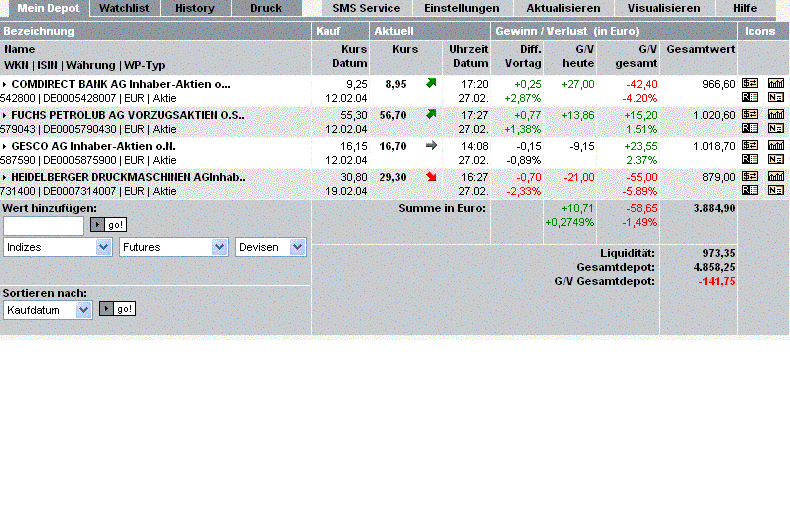 tron21 Februar 28, 2004 hier kommen die neuen stoppkurse: comdirect bank: 8,32 heidelberger druck: 27,70 fuchs petrolub: 51,75 gesco: 15,35 gpc biotech: 14,25 gibt es sonst irgendwas was euch am depot auffällt? schönes we euch allen!!!! Diesen Beitrag teilen Link zum Beitrag